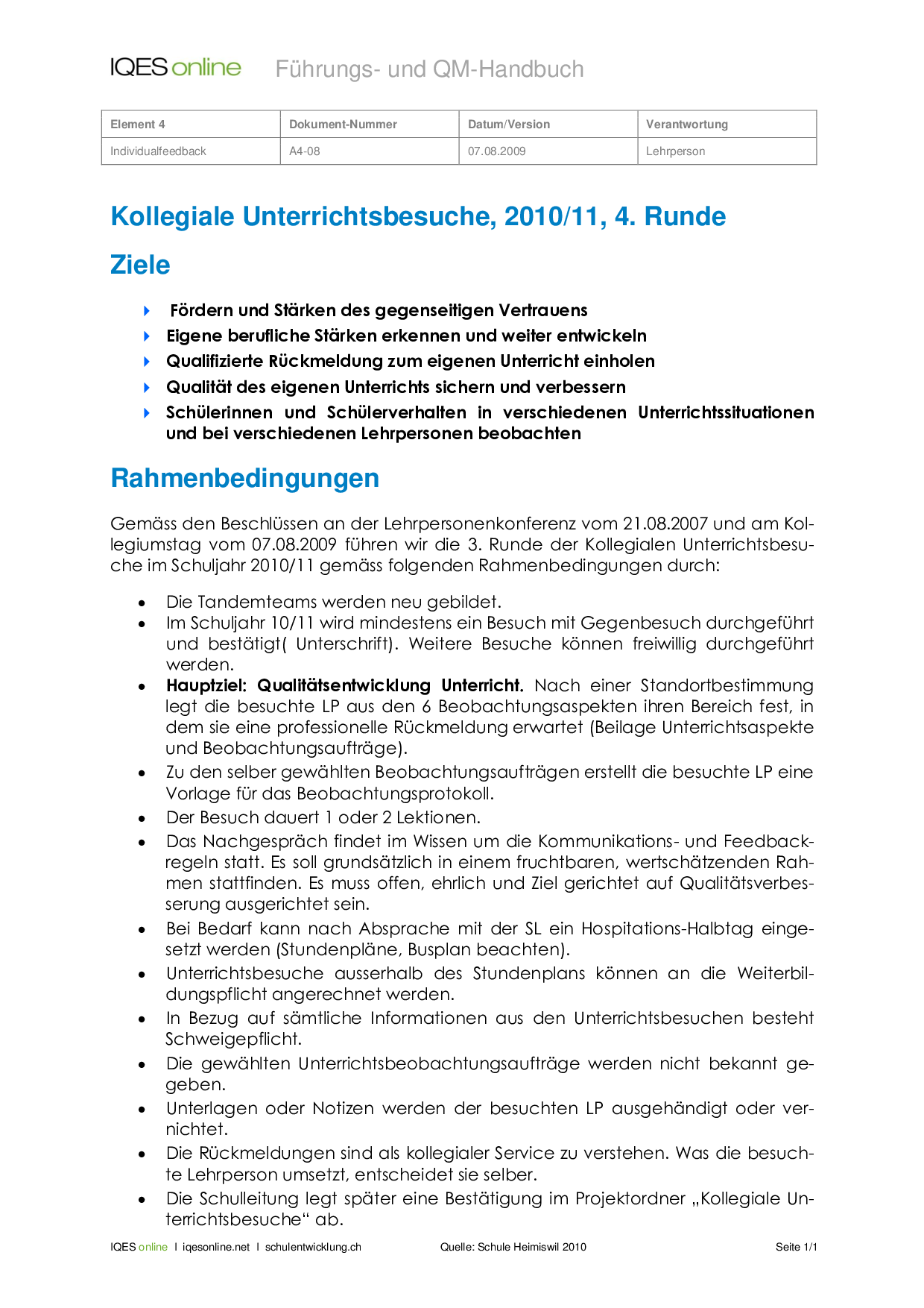In diesem Dokument werden die Vereinbarungen zum Kollegialfeedback und gegenseitigen Unterrichtsbesuchen an der Schule Heimiswil festgehalten. Zu diesem Zweck werden klare Rahmenbedingungen aufgestellt.