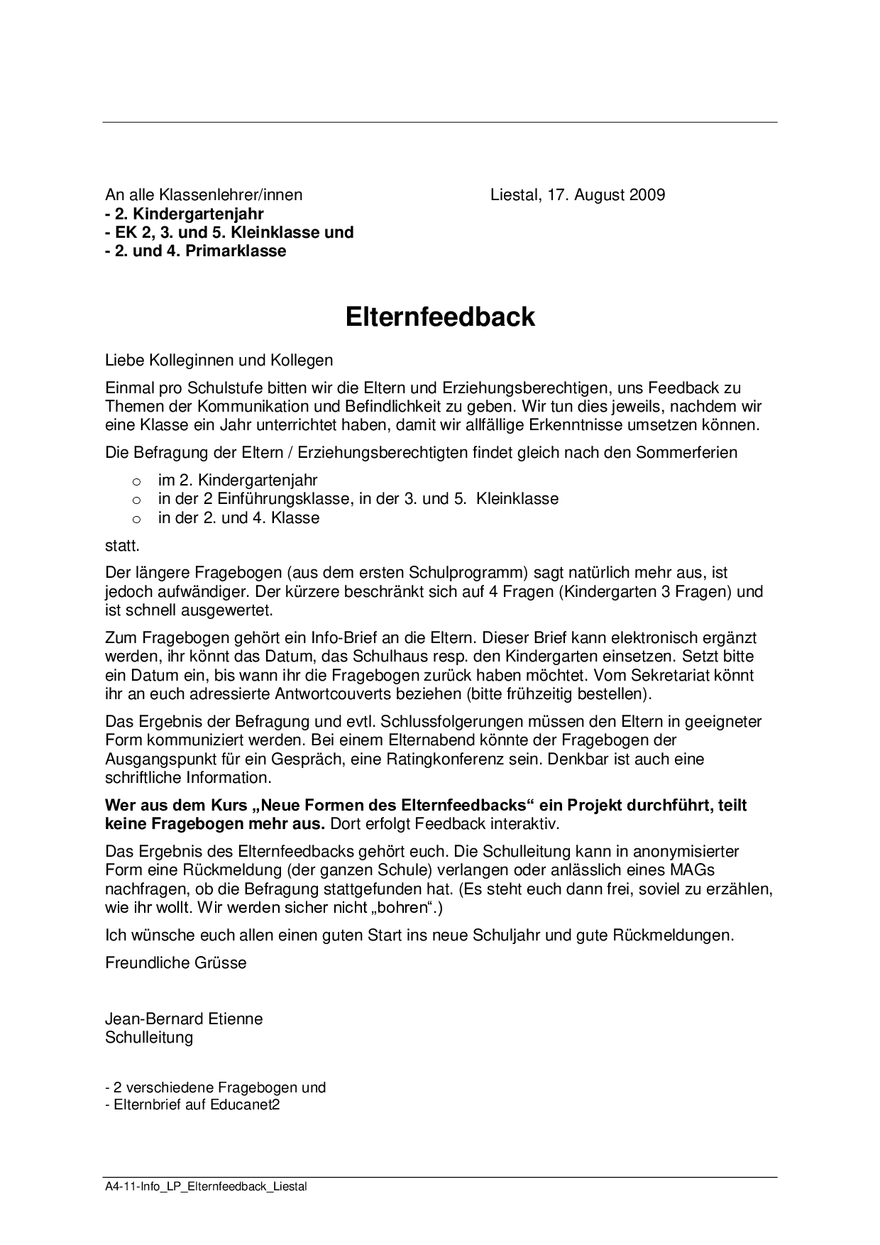 In diesem Dokument finden sie ein Beispiel für einen Elternbrief, der über eine Elternbefragung informiert. Dieser wurde von der Schule Liestal entworfen und kann als Vorlage oder Orientierungshilfe beim Entwurf eines eigenen Elternbriefs dienen.