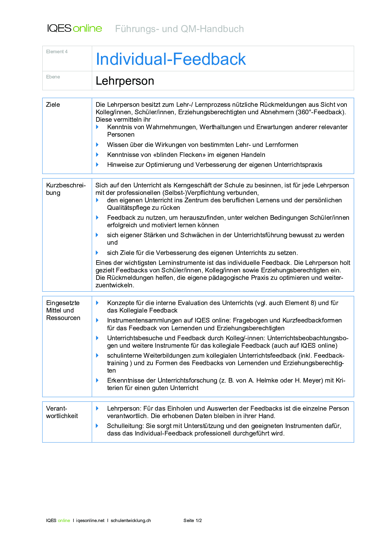 In diesem Dokument wird das Individualfeedback für Lehrpersonen kurz beschrieben. Dabei werden die Ziele sowie die einsetzbaren Mittel und Ressourcen erläutert. Zum Vergleich werden ausserdem Kennzeichen guter Praxis aufgeführt.