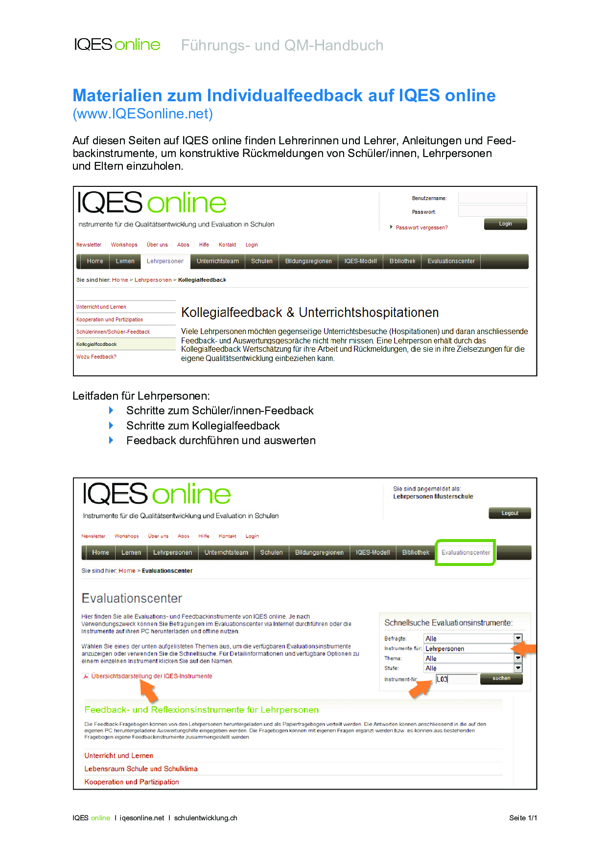 In diesem Dokument wird eine Übersicht über Materialien zum Individualfeedback auf IQES online geboten. Auf diesen finden Lehrpersonen Anleitungen und Feedbackinstrumente, um konstruktive Rückmeldungen von Lernenden, anderen Lehrpersonen und Eltern einzuholen.