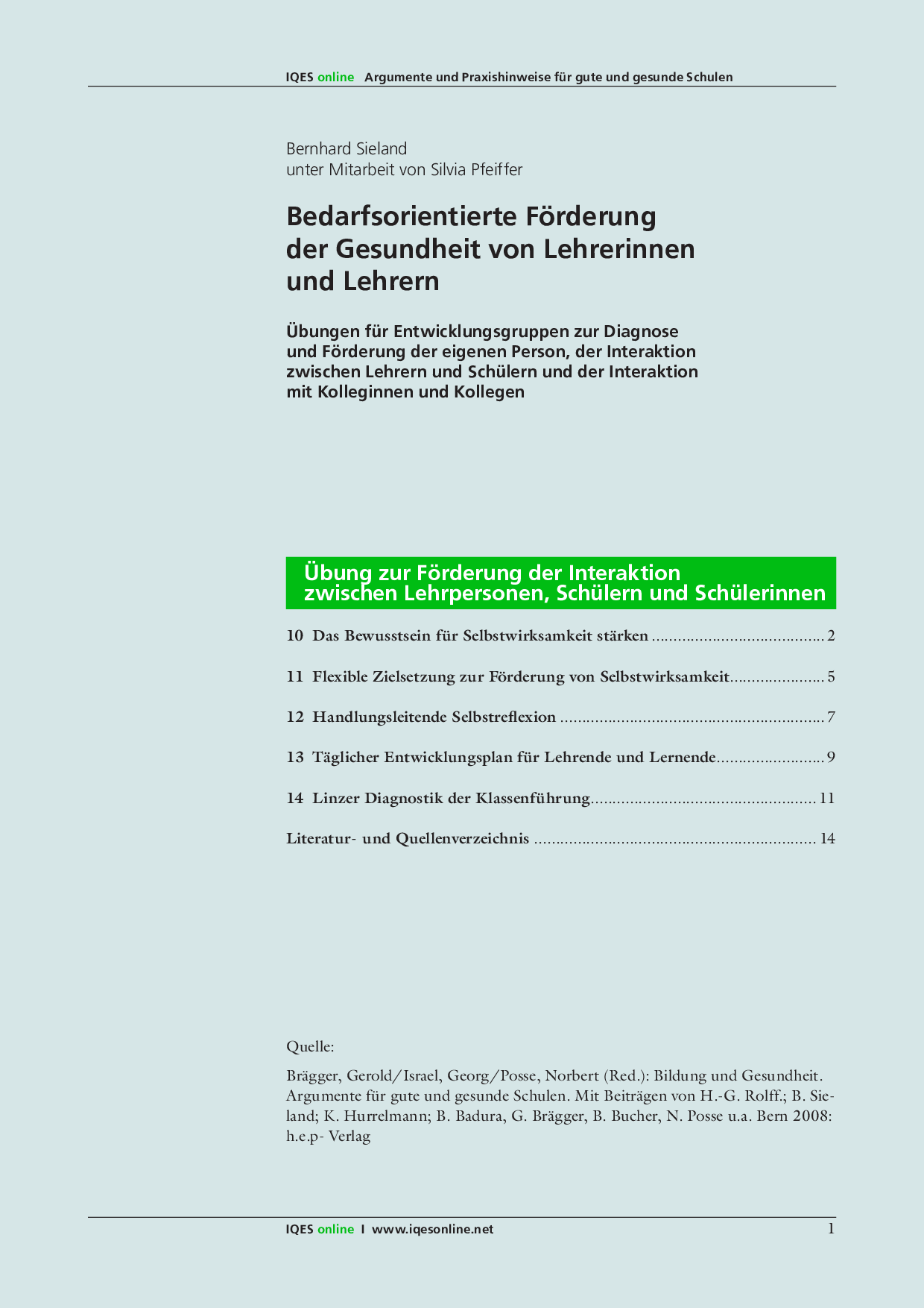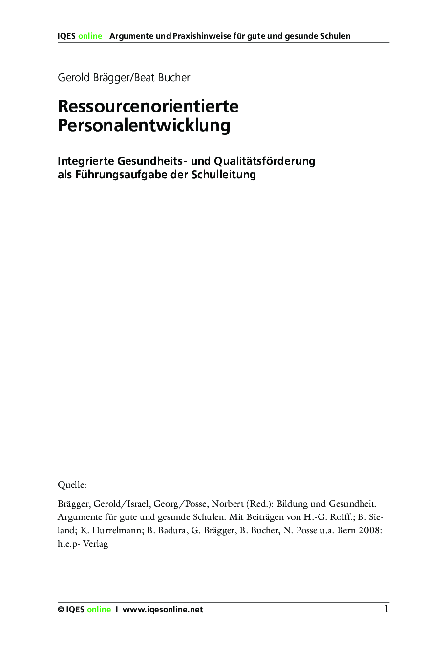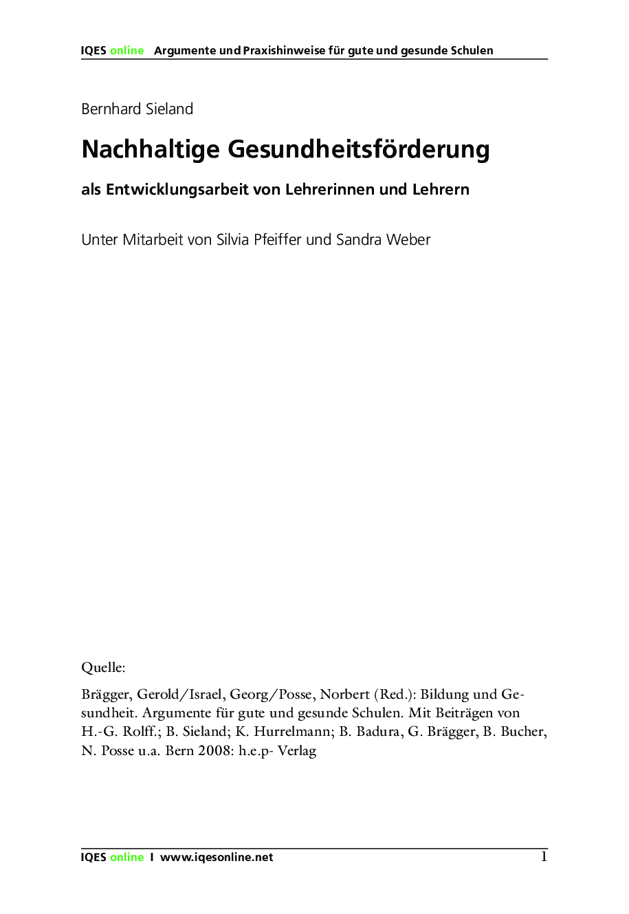 Gerold Brägger/ Norbert Posse/ Gerorg Israel (Red.): Bildung und Gesundheit. Argumente für eine gute und gesunde Schule. Mit Beiträgen von H.-G. Rolff.; B. Sieland; K. Hurrelmann; B. Bucher u.a. h.e.p.-Verlag: Bern 2008. ISBN 978-03905-347-6