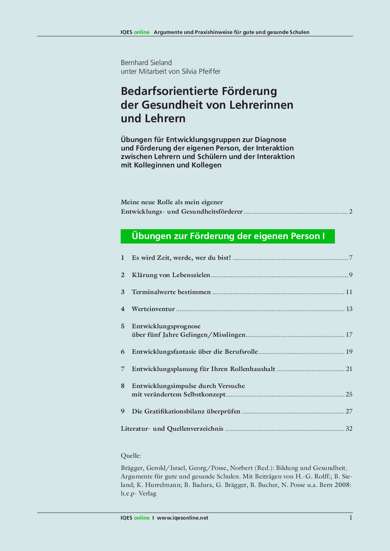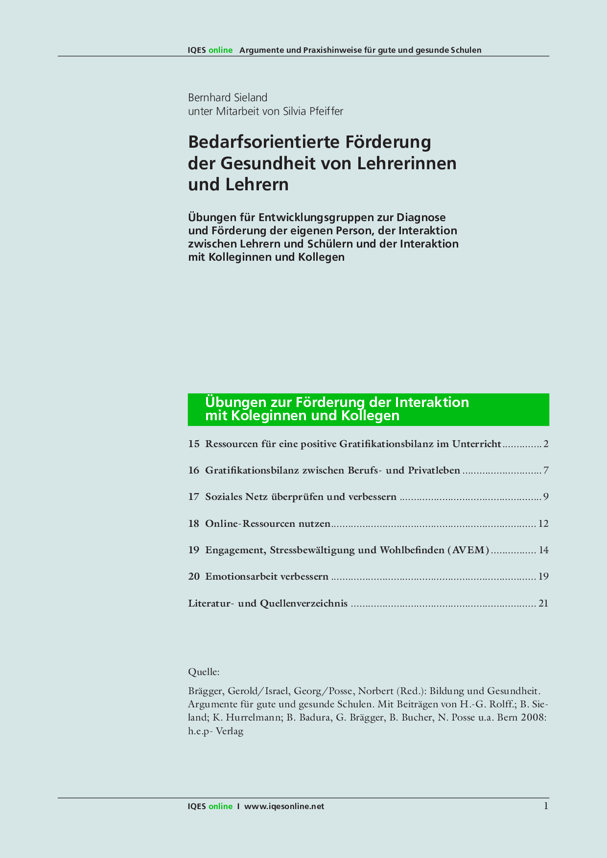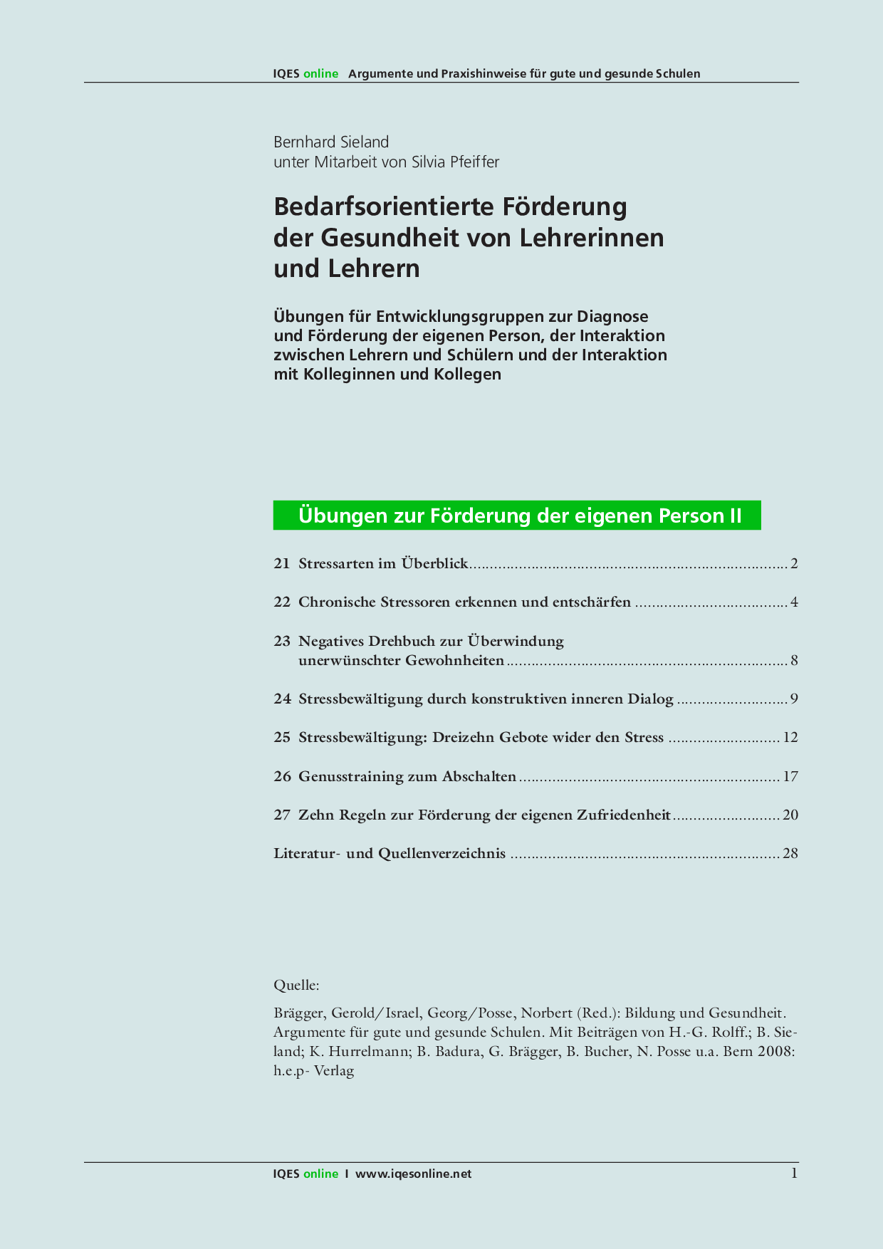 Gerold Brägger/ Norbert Posse/ Gerorg Israel (Red.): Bildung und Gesundheit. Argumente für eine gute und gesunde Schule. Mit Beiträgen von H.-G. Rolff.; B. Sieland; K. Hurrelmann; B. Bucher u.a. h.e.p.-Verlag: Bern 2008. ISBN 978-03905-347-6