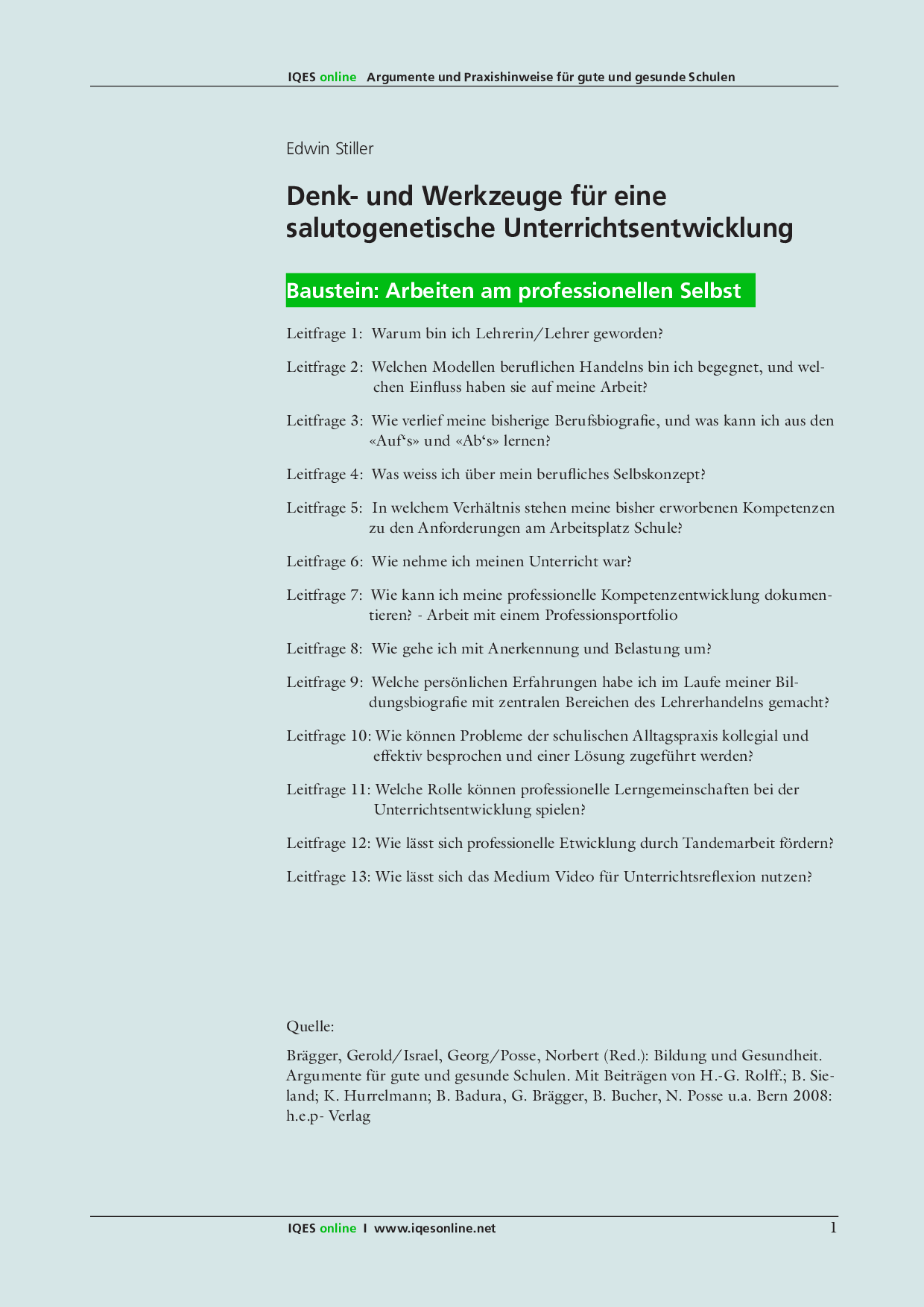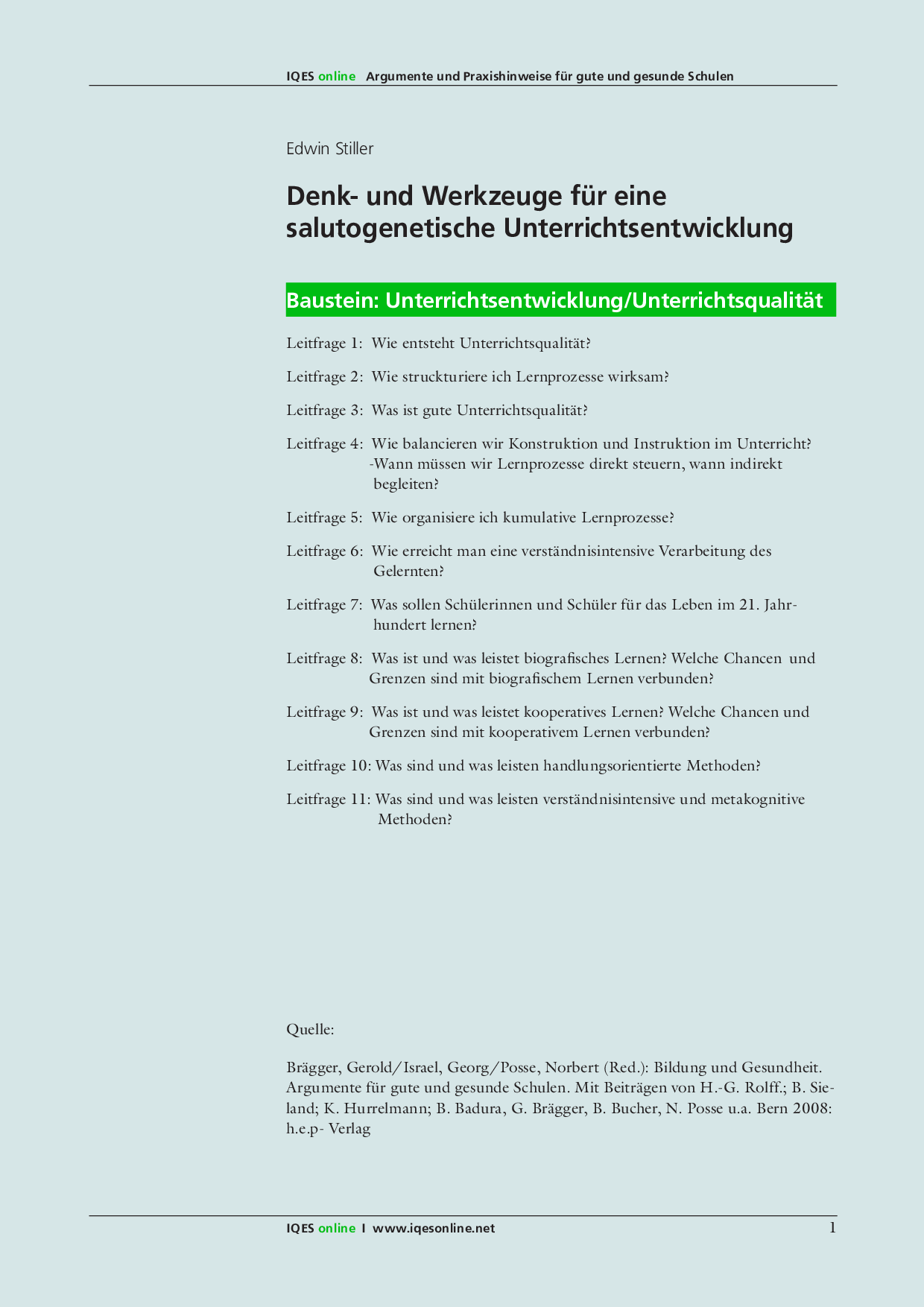 Herkunft: Gerold Brägger, Norbert Posse, Georg Israel: Bildung und Gesundheit. Argumente für eine gute und gesunde Schule. hep-verlag, 2008. ISBN 9783039053476