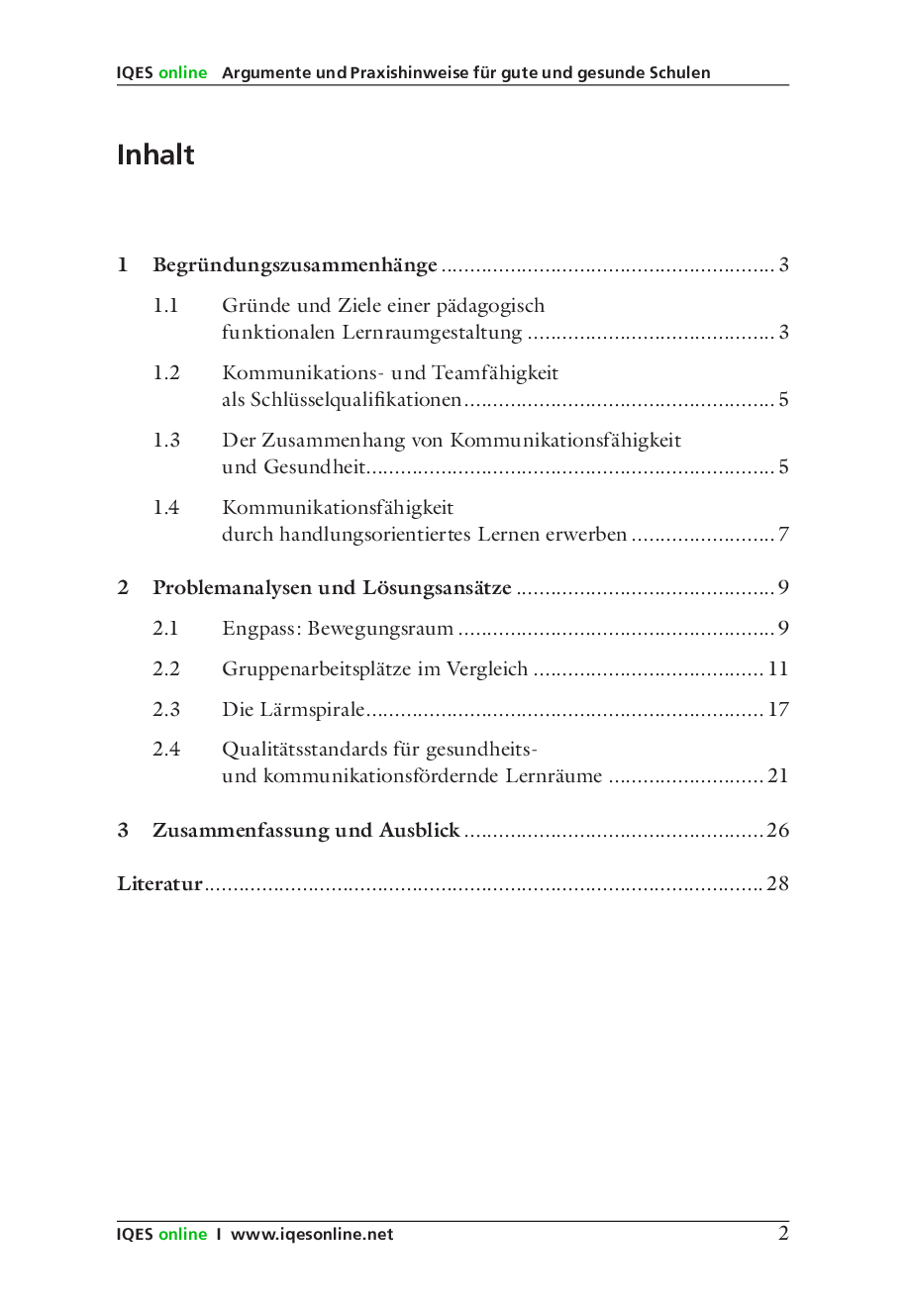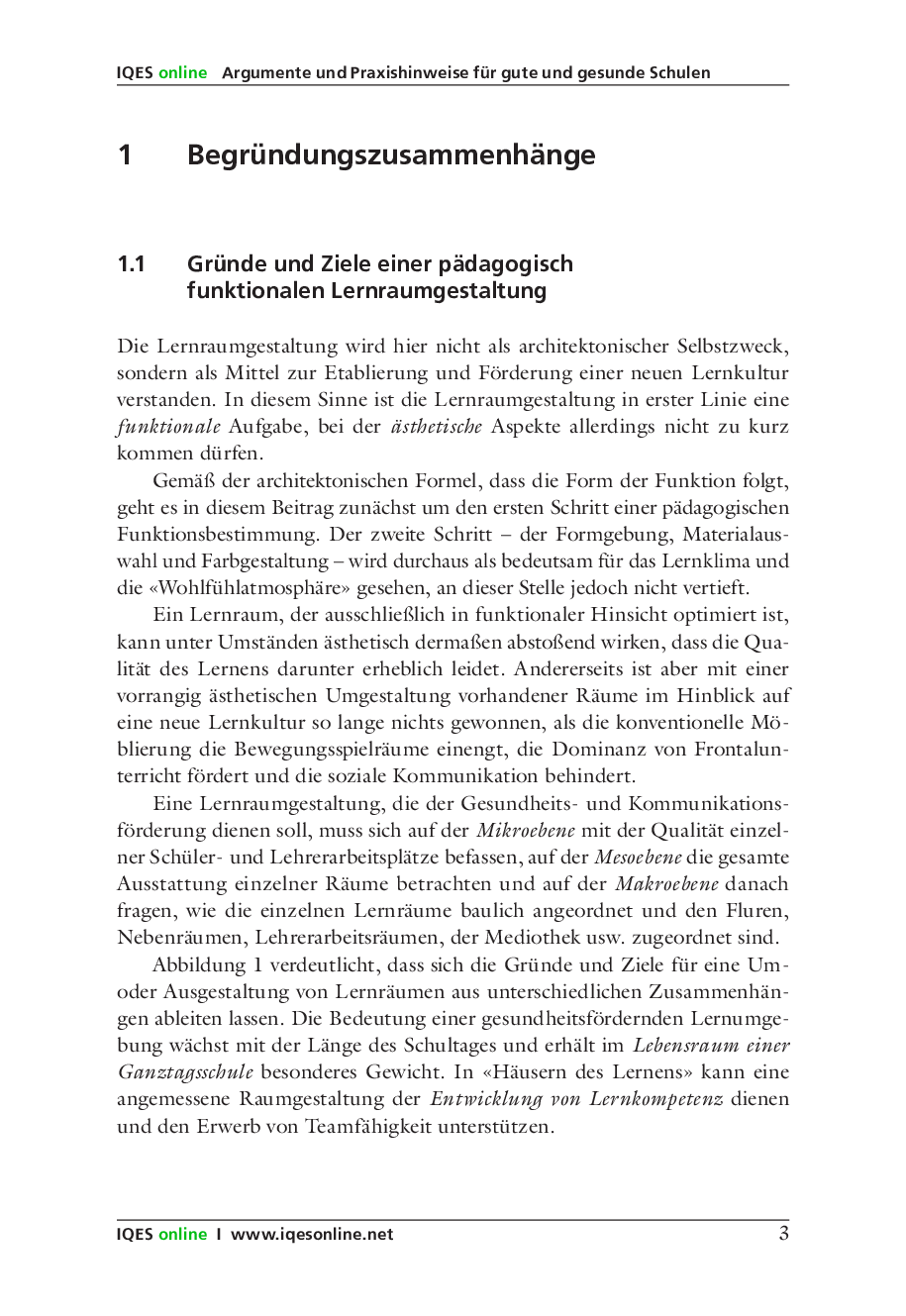 In diesen drei Kapiteln wird die Gestaltung von Lernräumen verhandelt, so dass diese gesundheits- und kommunikationsfördernde Lebensräume ergeben. Es werden Zusammenhänge aufgezeigt sowie Problemanalysen und Lösungsansätze präsentiert.