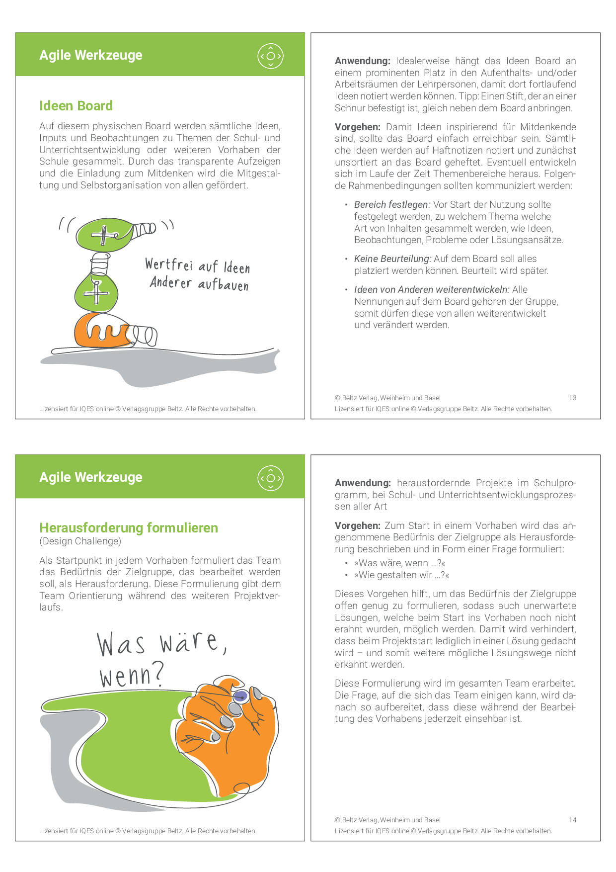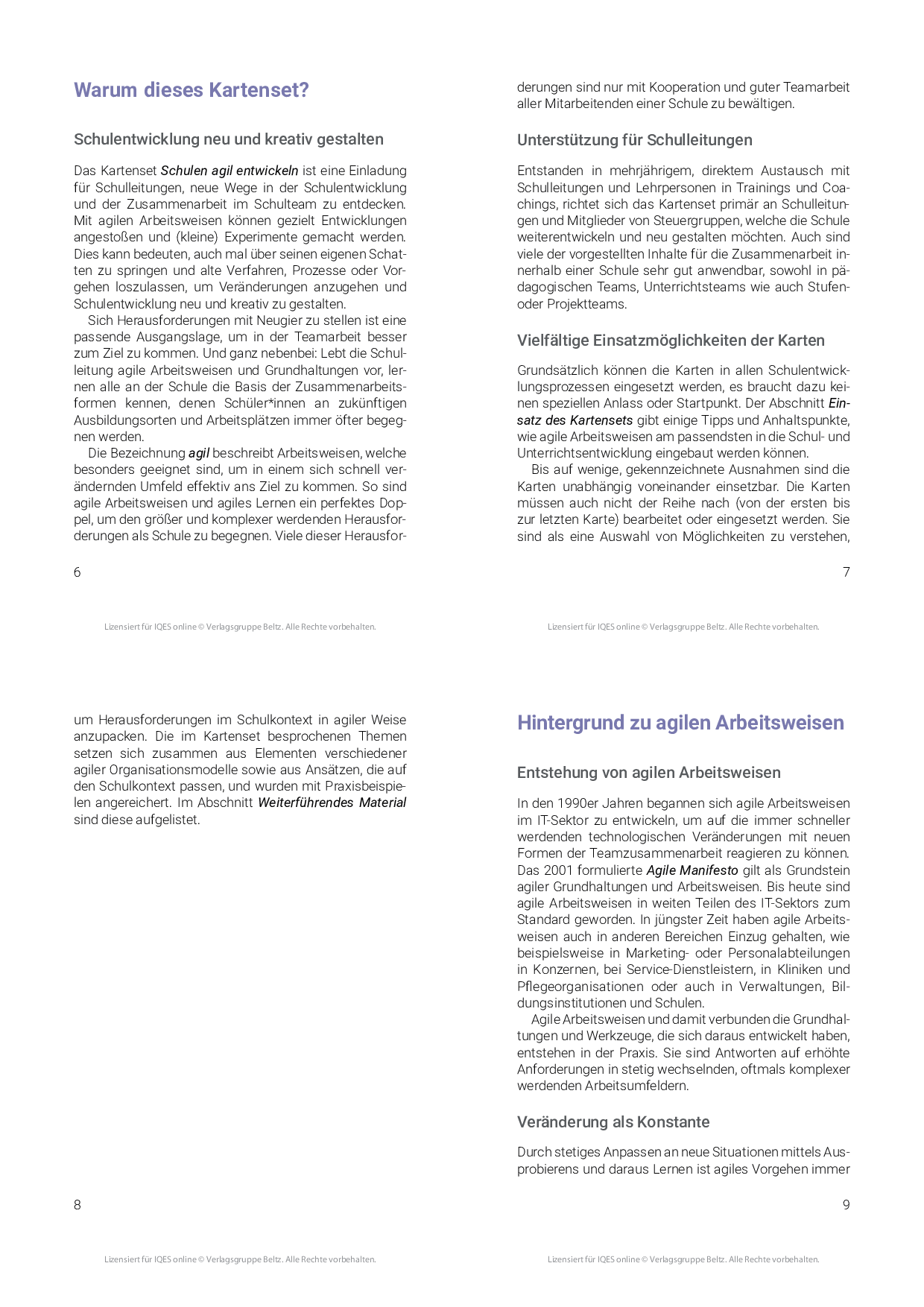Entstanden in mehrjährigem, direktem Austausch mit Schulleitungen und Lehrpersonen durch Trainings und Coachings, richten sich die Materialien für agile Schulentwicklung primär an Schulleitungen und Mitglieder von Steuergruppen, welche die Schule weiterentwickeln und neugestalten möchten. Viele der vorgestellten Inhalte sind auch für die weitere Zusammenarbeit innerhalb einer Schule sehr gut anwendbar, sowohl in pädagogischen Teams, Unterrichtsteams wie auch in Fachschaften, Stufen- oder Projektteams. Das Pendent zu diesem Kartenset ist «Agiles Lernen an Schulen». Dieses zeigt, wie agile Werkzeuge und Prinzipien von Lehrpersonen und Lernenden direkt im Unterricht eingesetzt werden können.