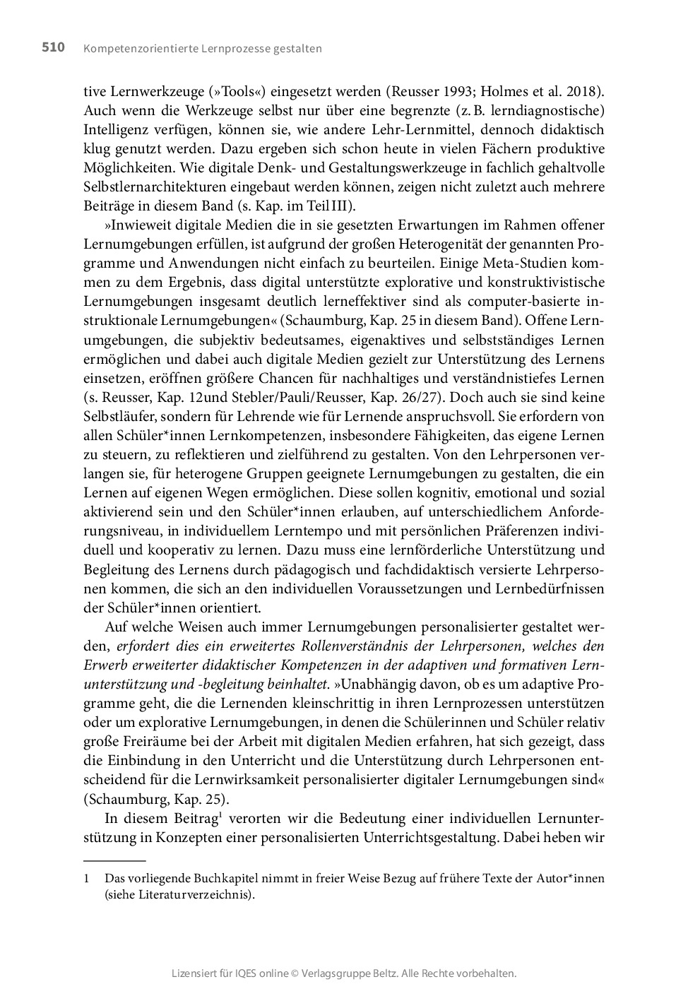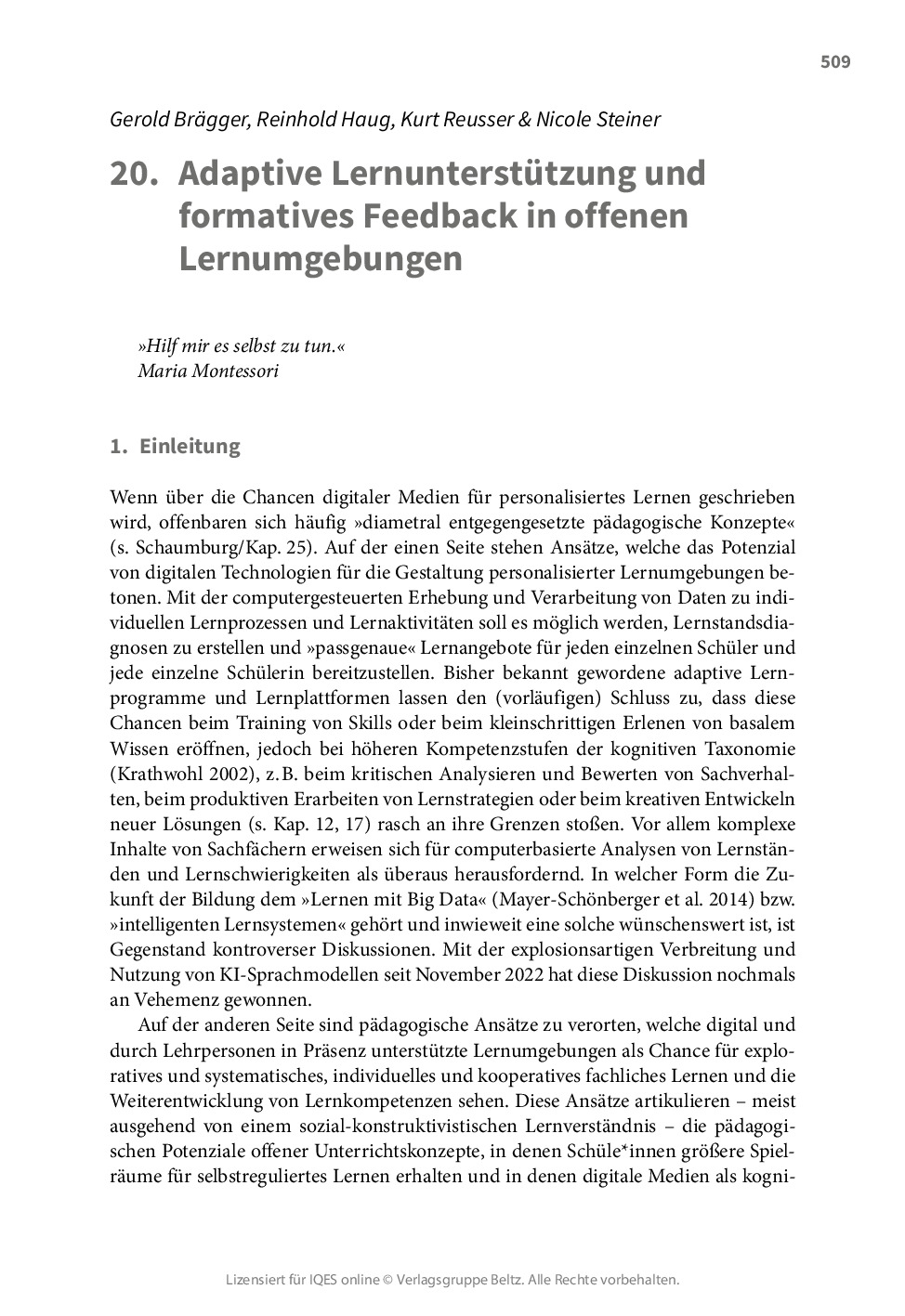 Schüler:innen sind in offenen Lernumgebungen auf eine adaptive Lernunterstützung und lernförderliches Feedback angewiesen. Doch wie lässt sich beides im Unterrichtsalltag realisieren? Wie gelingt es Lehrpersonen die Lernenden auf eine Weise zu begleiten, die eine aktive und verständnisorientierte Auseinandersetzung mit anspruchsvollen Aufgaben fördert? Wie können leistungsschwächere Schüler:innen, die in offenen Unterrichtsformen häufig überfordert sind, unterstützt werden? In diesem Beitrag verorten die Autor:innen die Bedeutung einer individuellen Lernunterstützung in Konzepten einer personalisierten Unterrichtsgestaltung. Sie beschreiben praxisnahe Konzepte und Strategien, skizzieren Formate und Handlungsabläufe der adaptiven Lernunterstützung und porträtieren analoge und digitale Werkzeuge. Dabei gehen sie besonders auf die Chancen, Potenziale und Risiken KI-basierter Rückmeldungs- und Unterstützungssysteme ein.