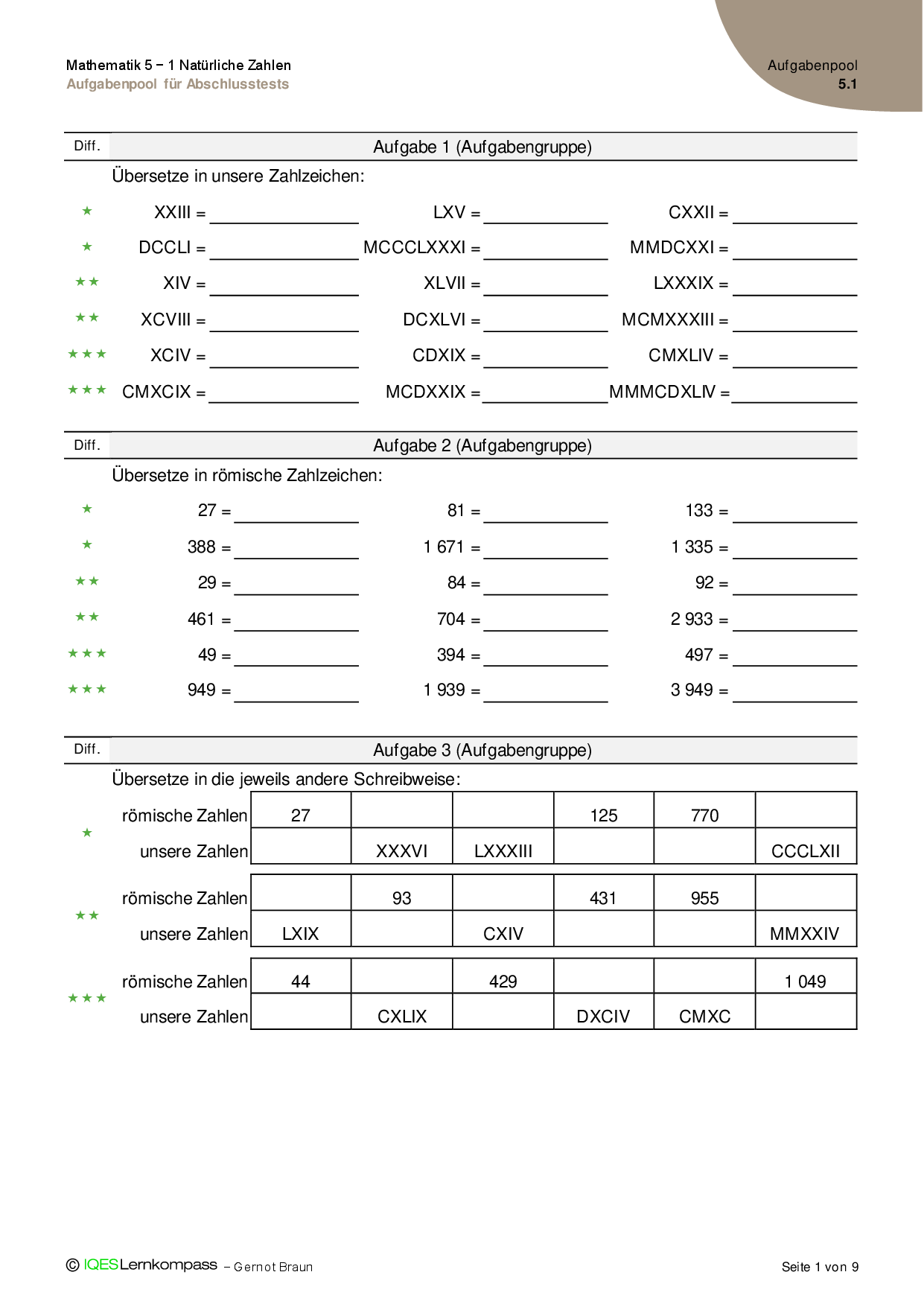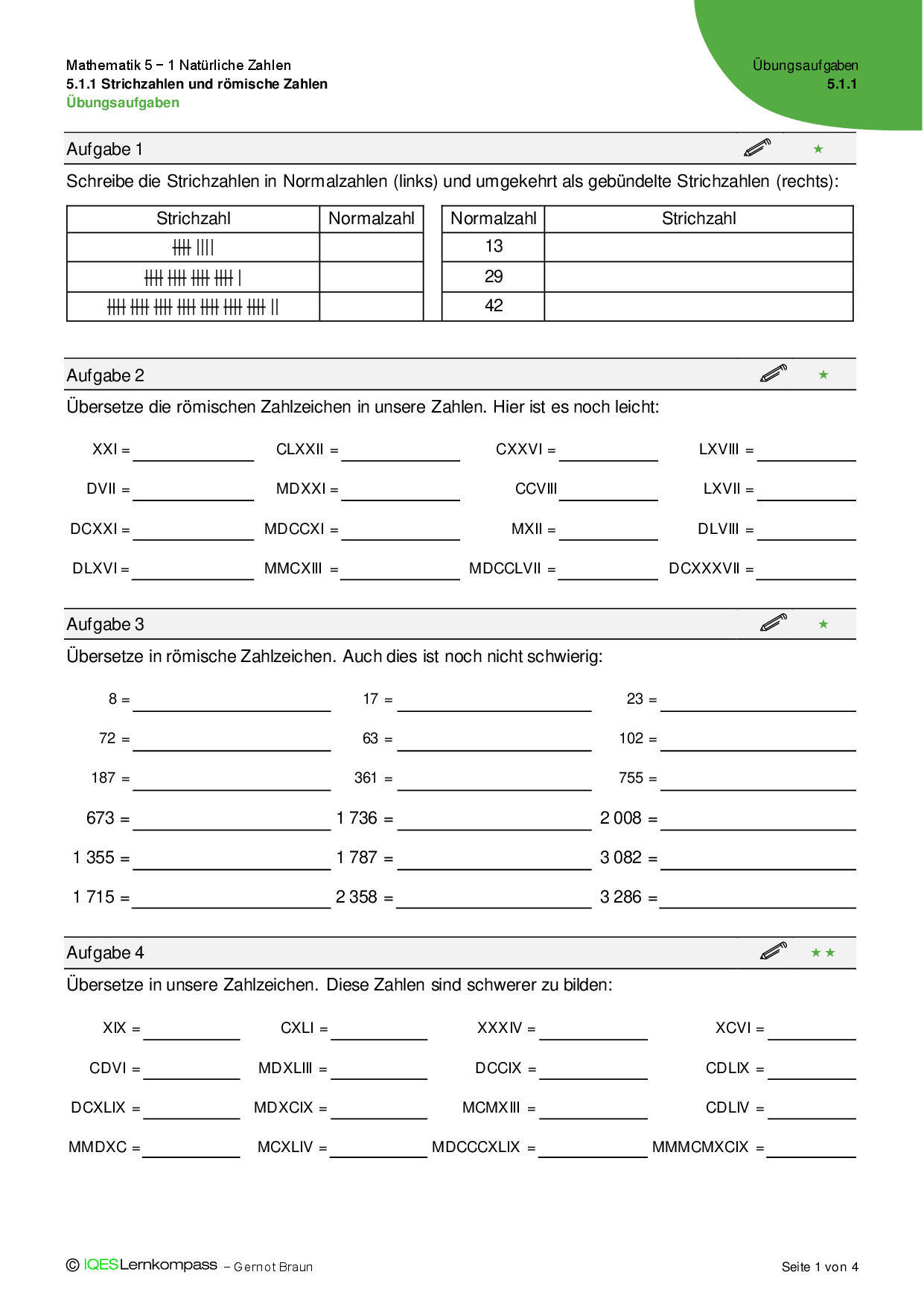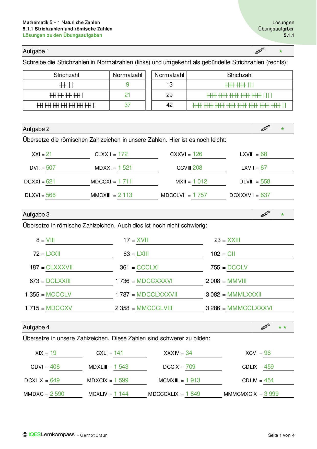 5.1.1 Strichzahlen und römische Zahlen – Übungsaufgaben mit Lösungen