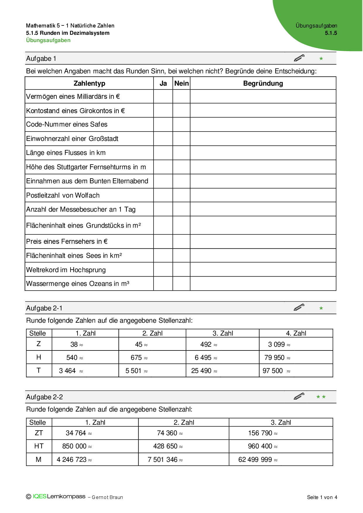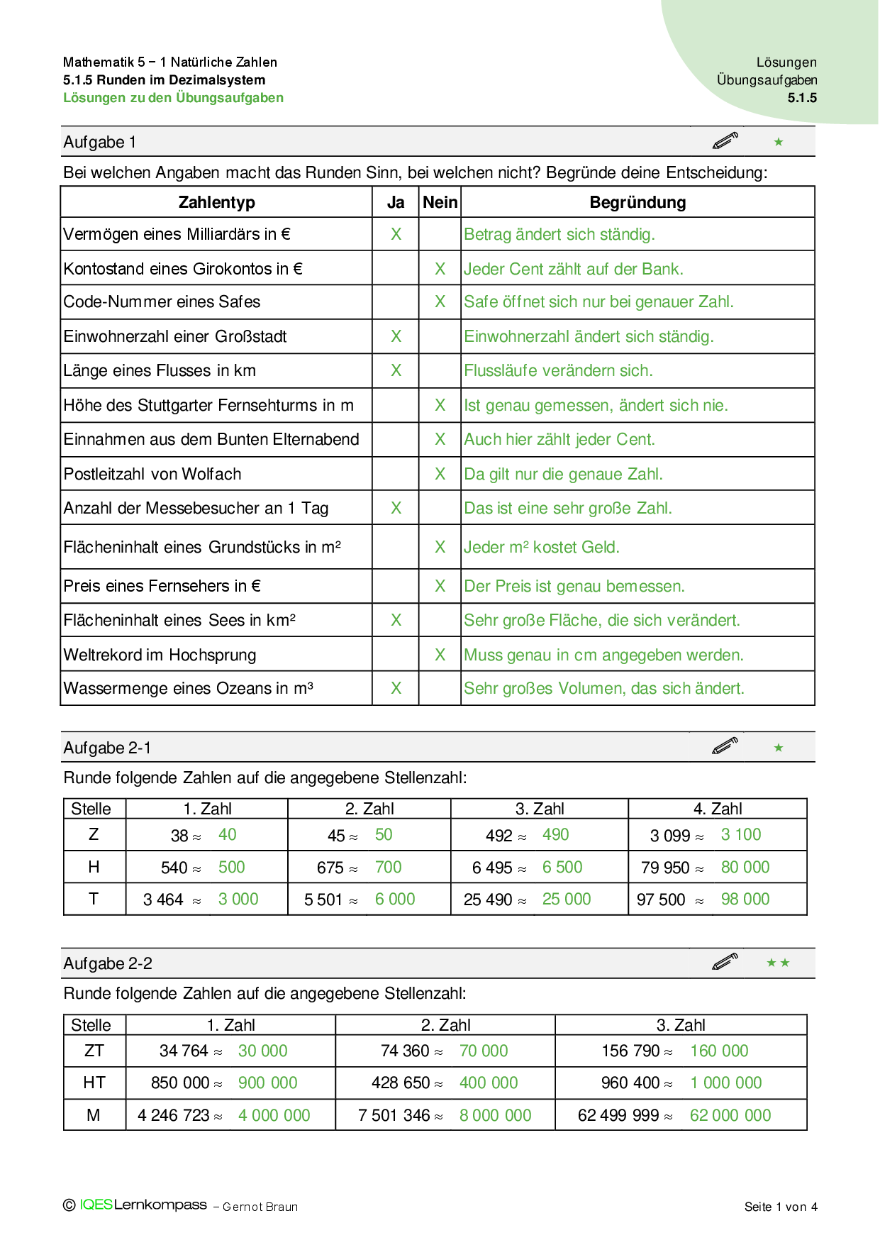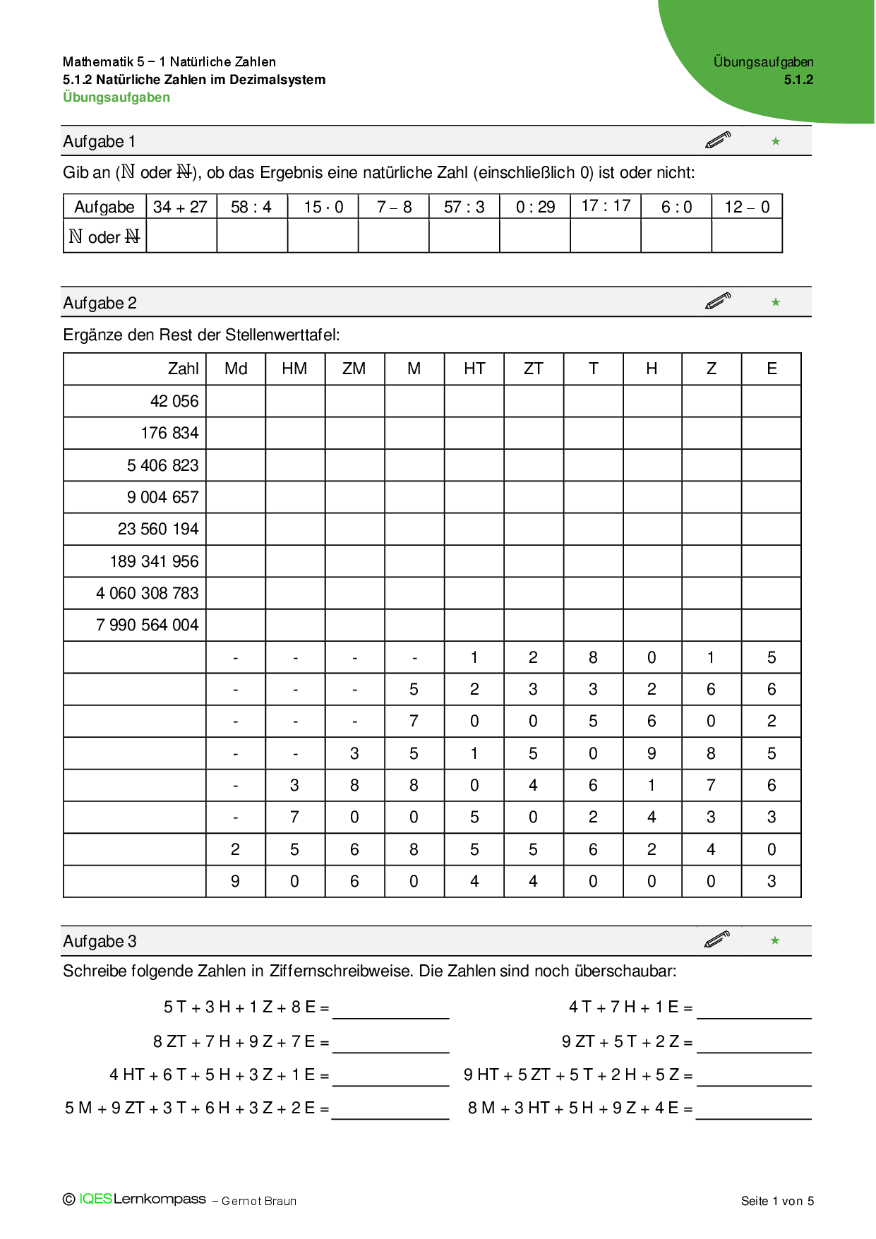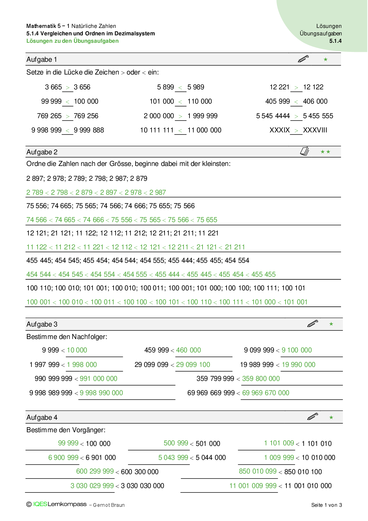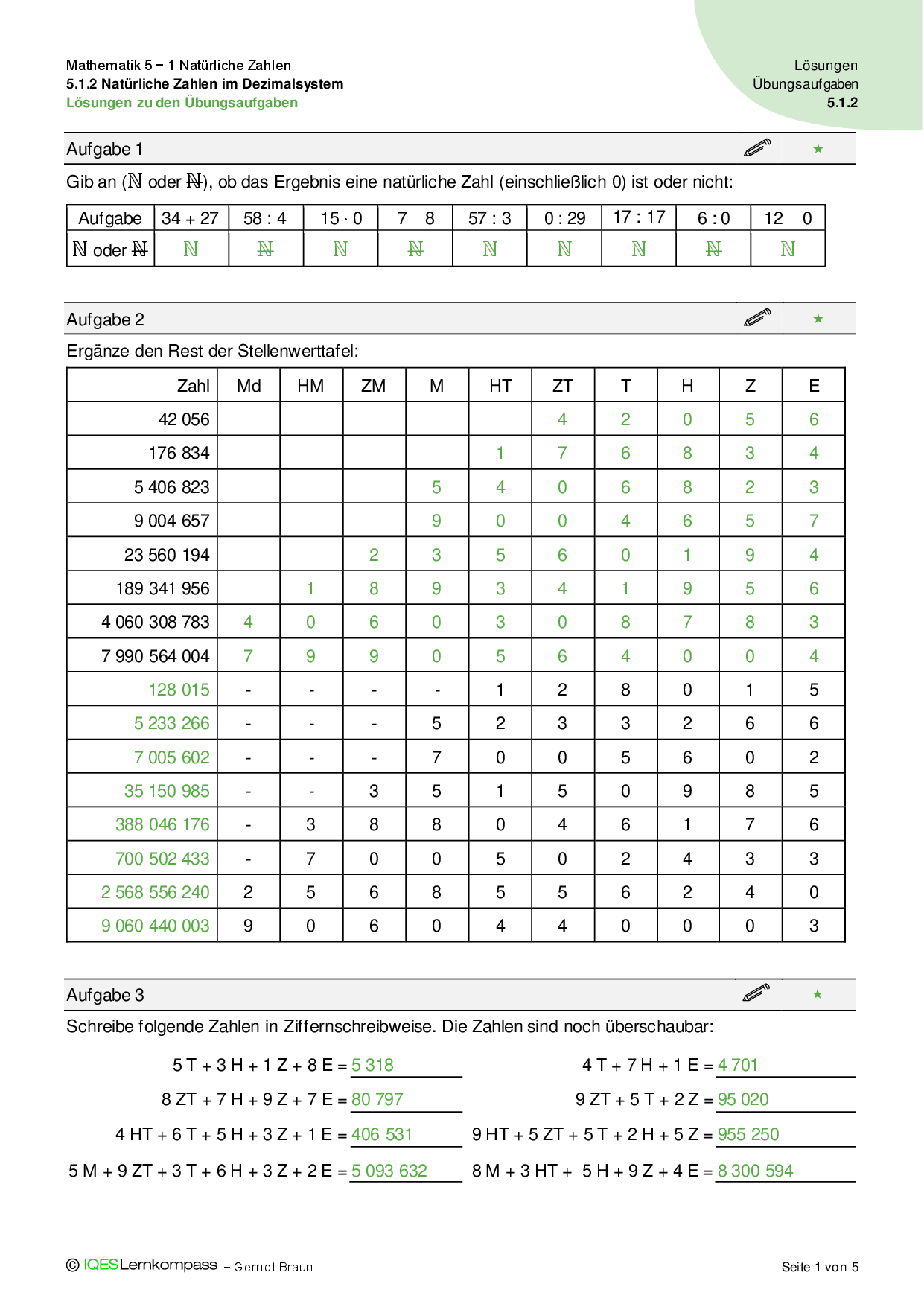 5.1.2 Natürliche Zahlen im Dezimalsystem – Übungsaufgaben mit Lösungen