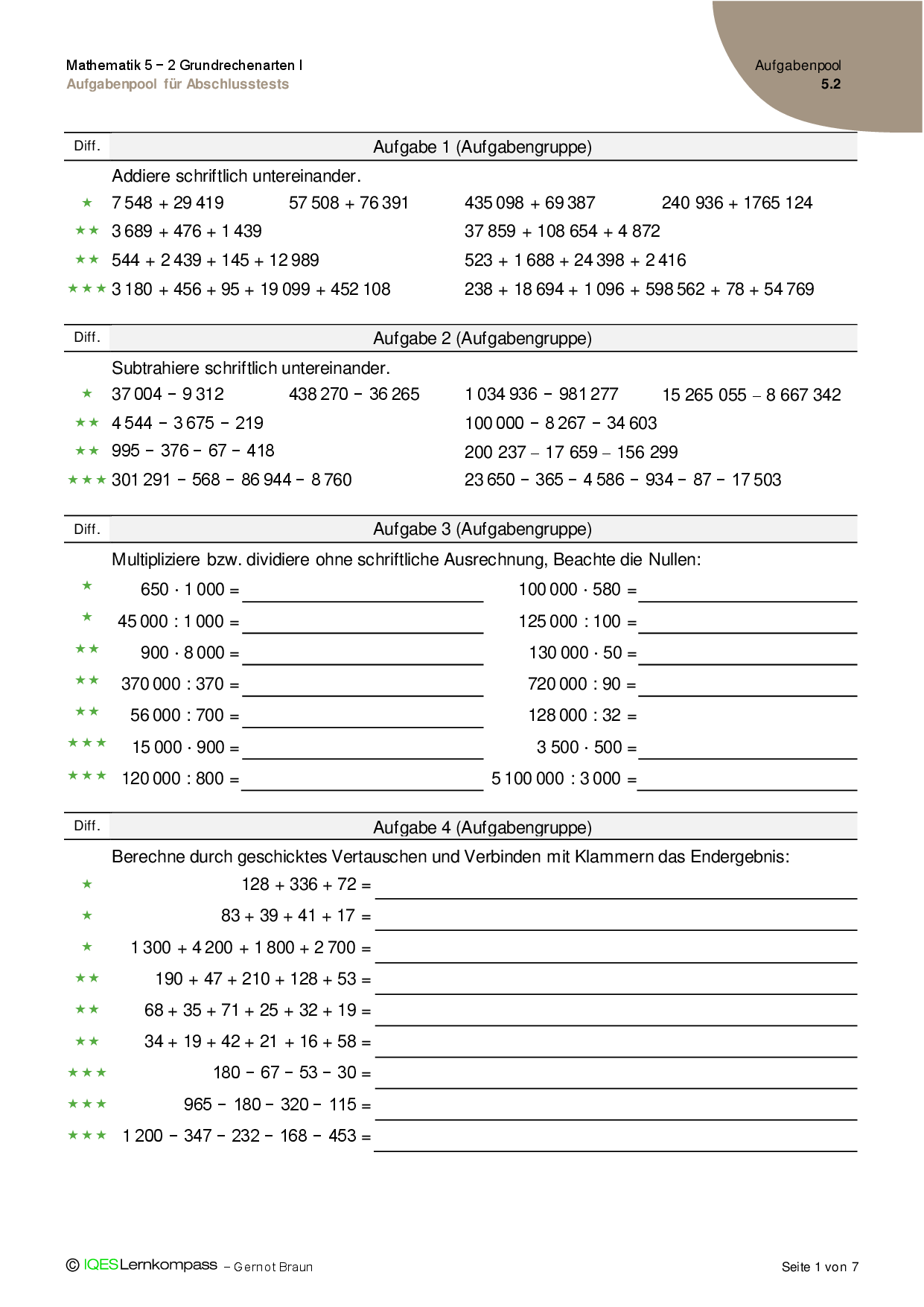 5.2 Grundrechenarten 1 – Aufgabenpool für Abschlusstests