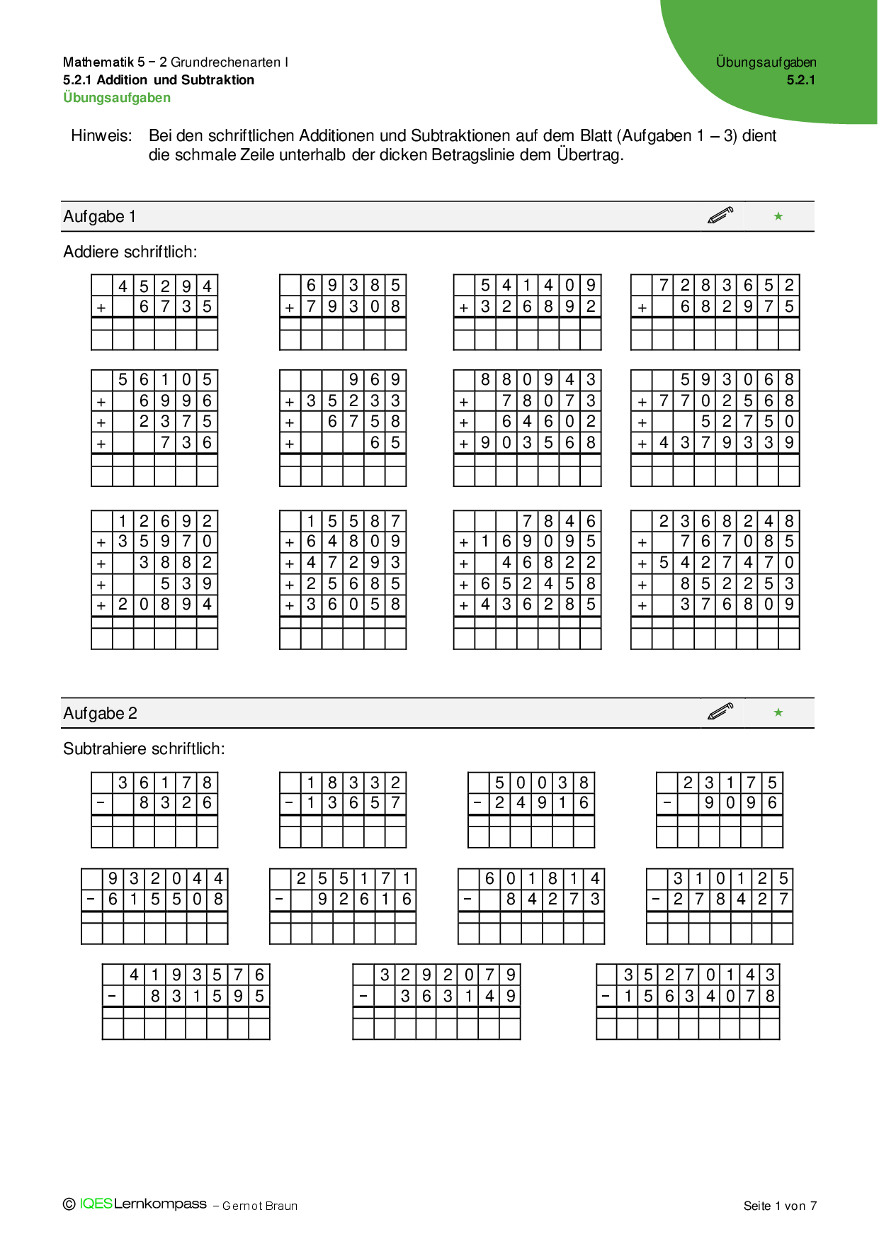 5.2.1 Addition und Subtraktion – Übungsaufgaben mit Lösungen