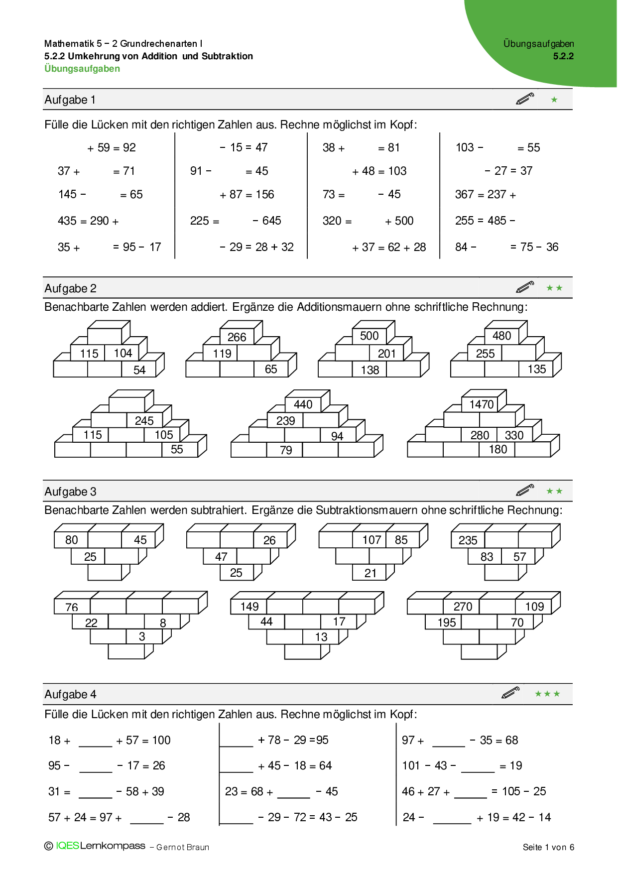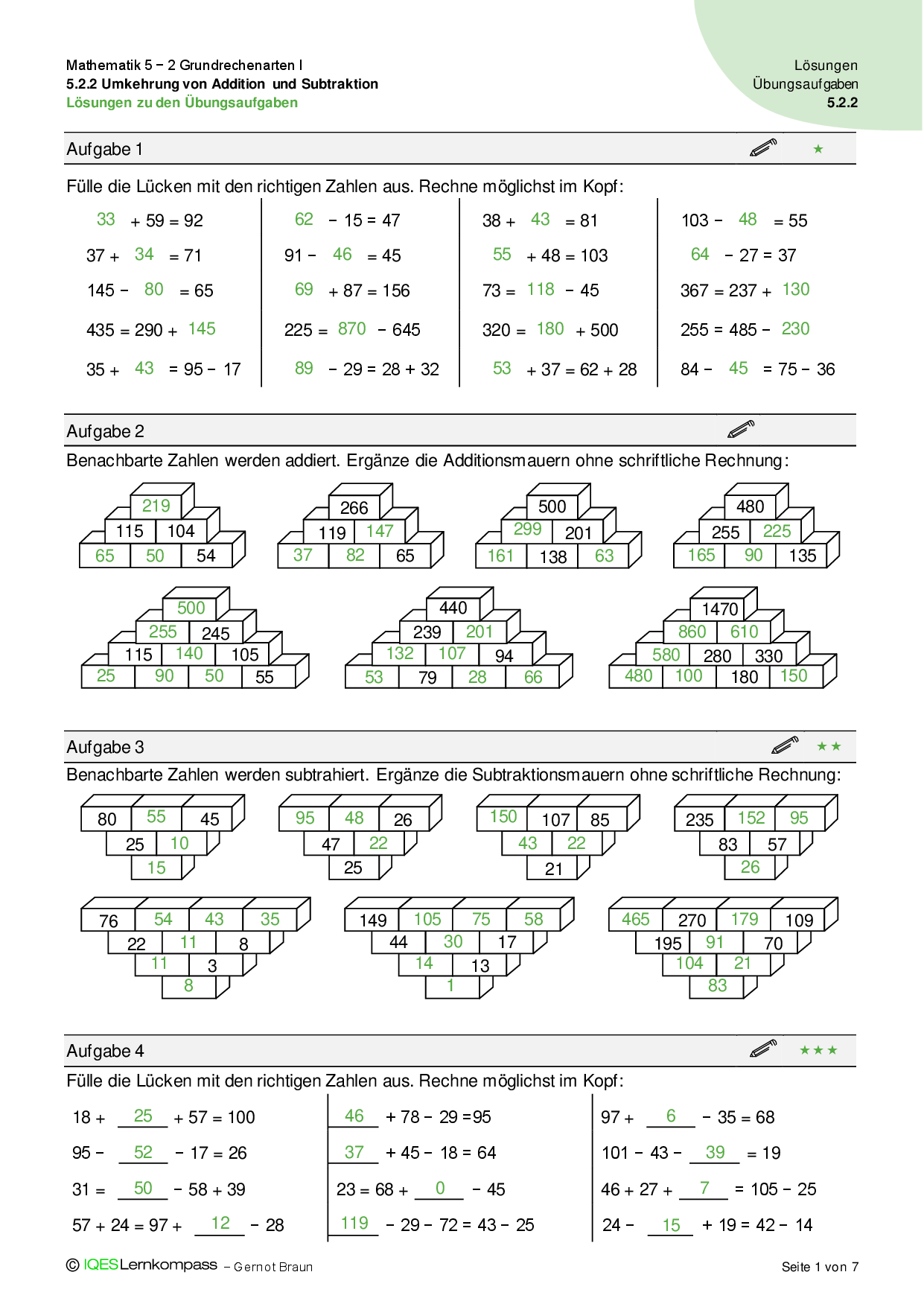 5.2.2 Umkehrung von Addition und Subtraktion – Übungsaufgaben mit Lösungen