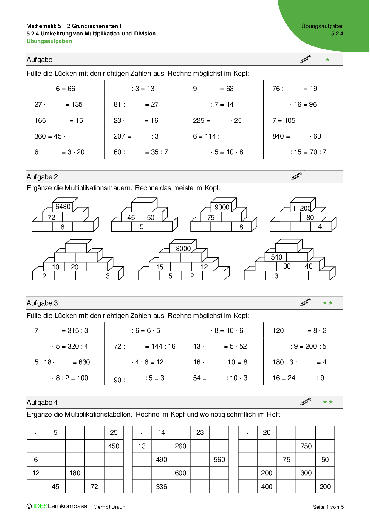 5.2.4 Umkehrung von Multiplikation und Division – Übungsaufgaben mit Lösungen