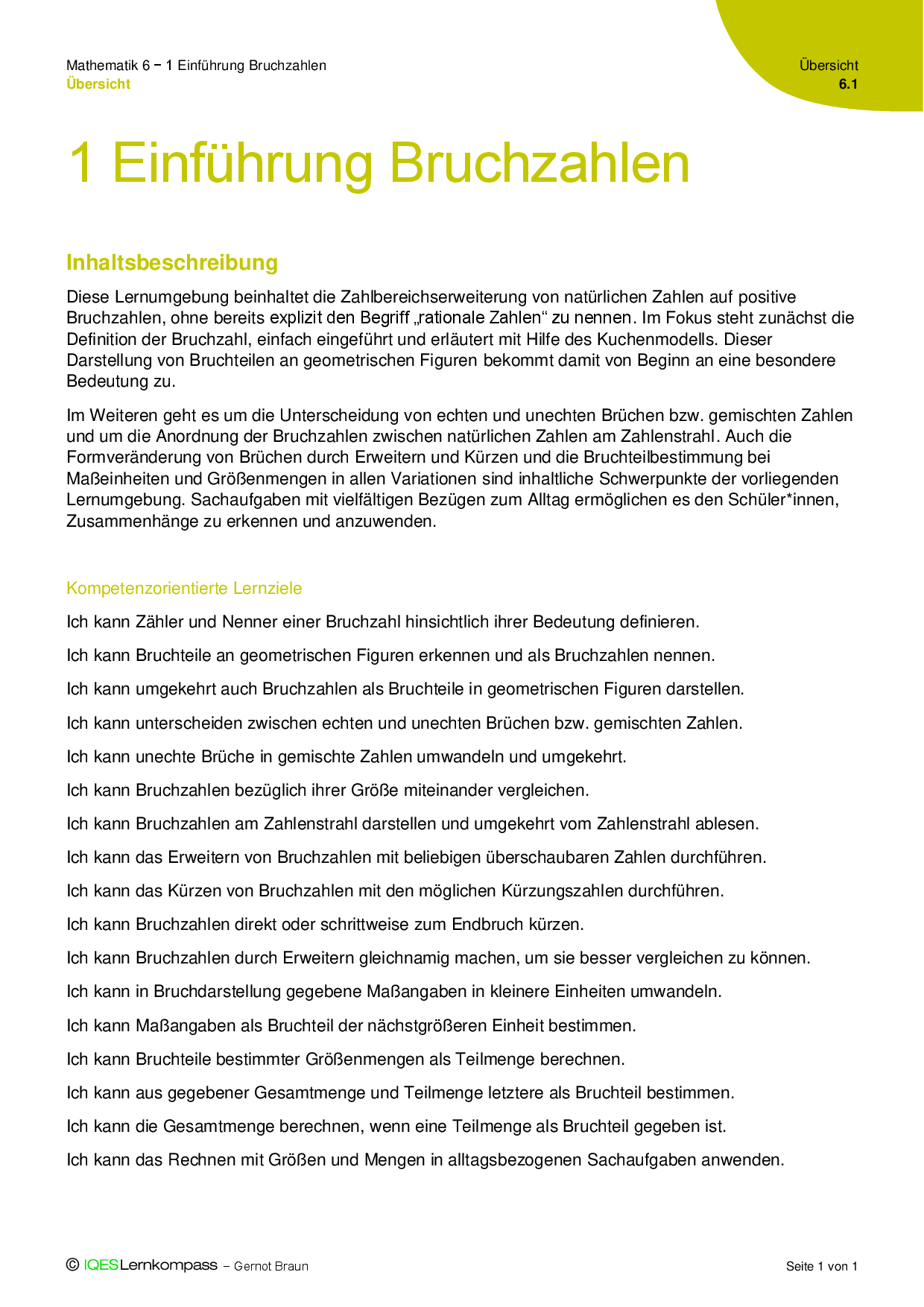 Lernziele und Inhalte: 6.1 Einführung Bruchzahlen