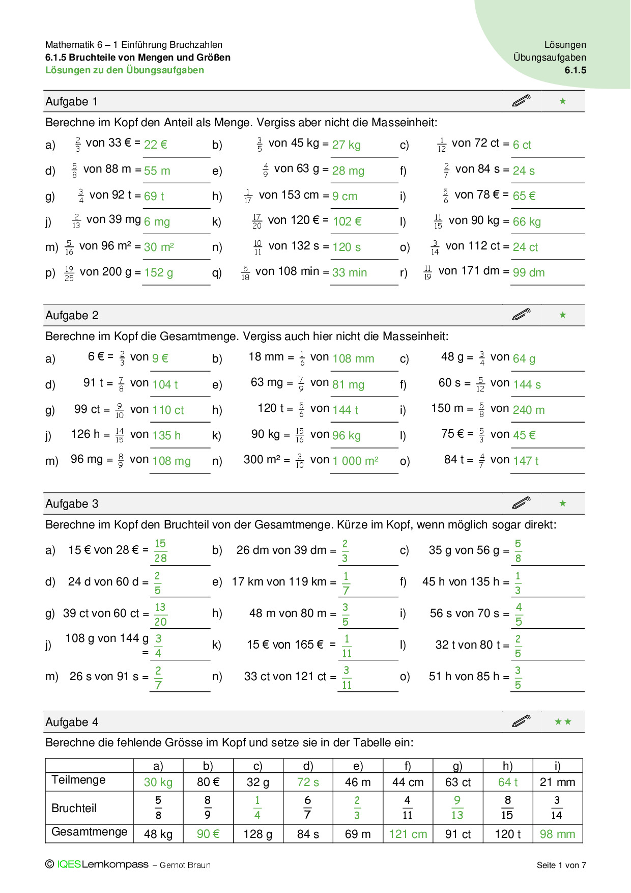 6.1.5 Bruchteile von Mengen und Grössen – Übungsaufgaben mit Lösungen