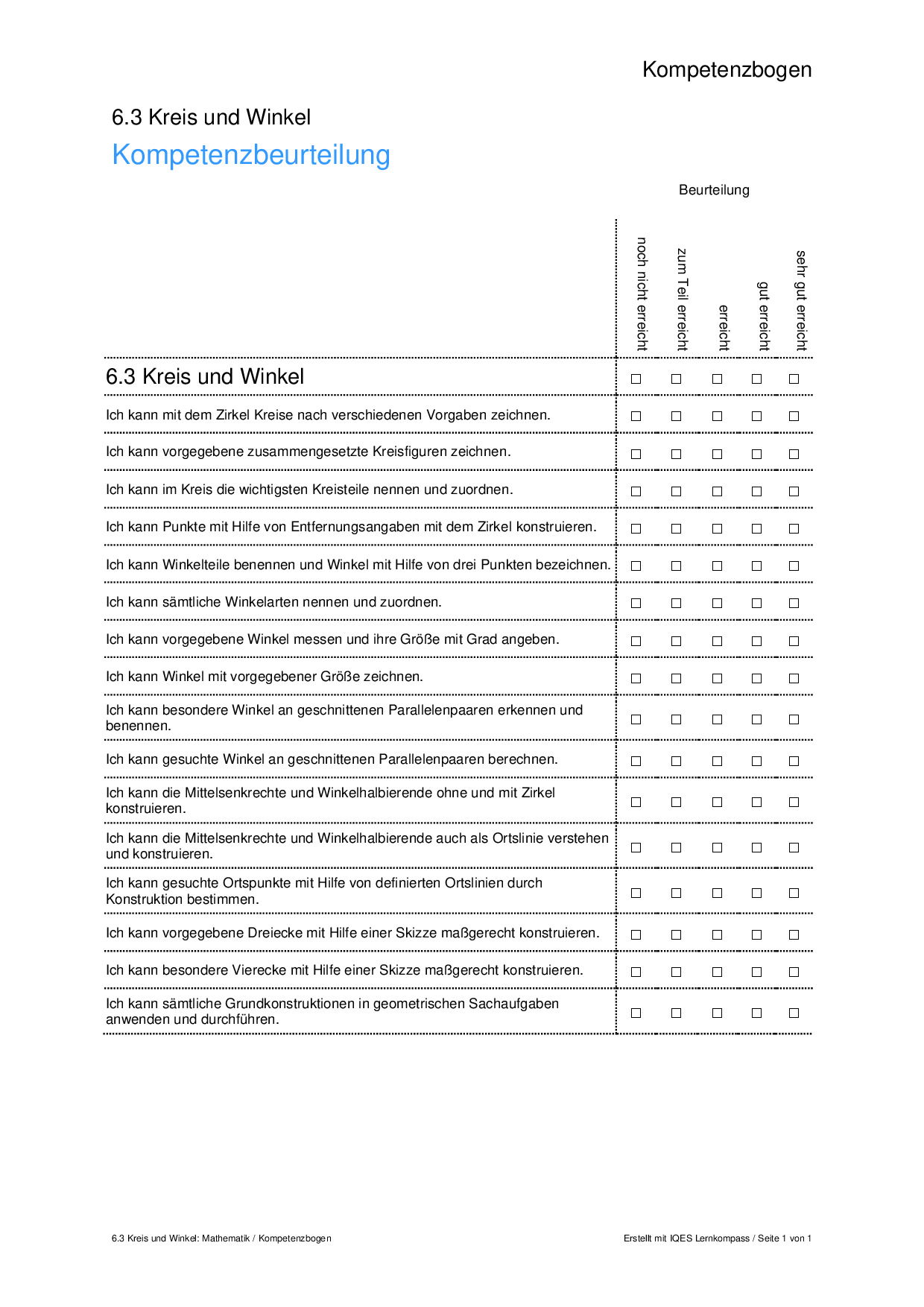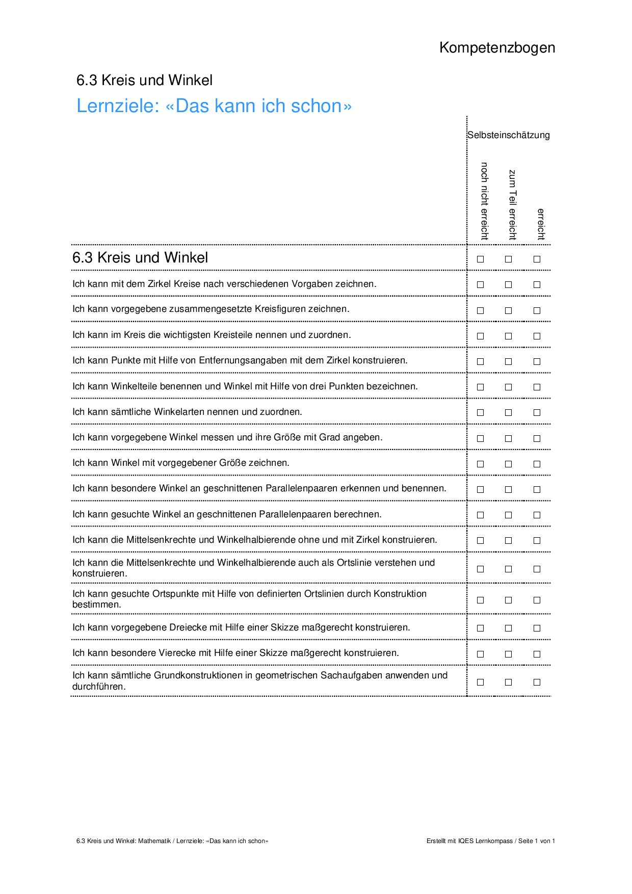 Einschätzungsbogen für Schüler*innen. Erstellt mit dem IQES-Lernkompass.