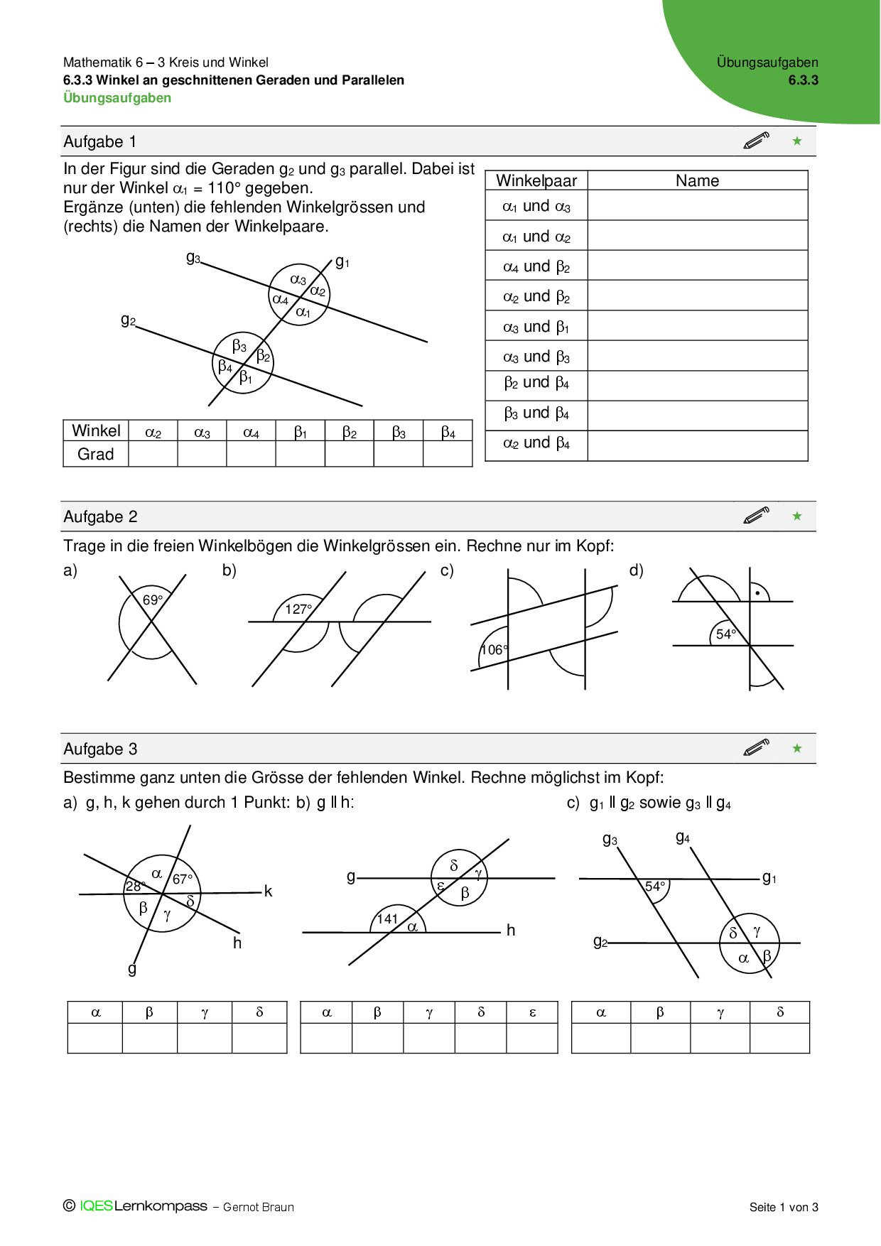 6.3.3 Winkel an geschnittenen Geraden und Parallelen – Übungsaufgaben mit Lösungen