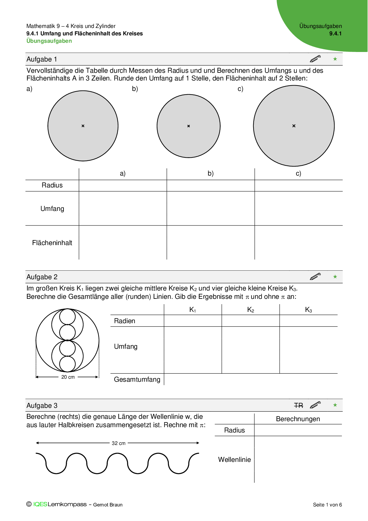 9.4.1 Umfang und Flächeninhalt des Kreises - Übungsaufgaben