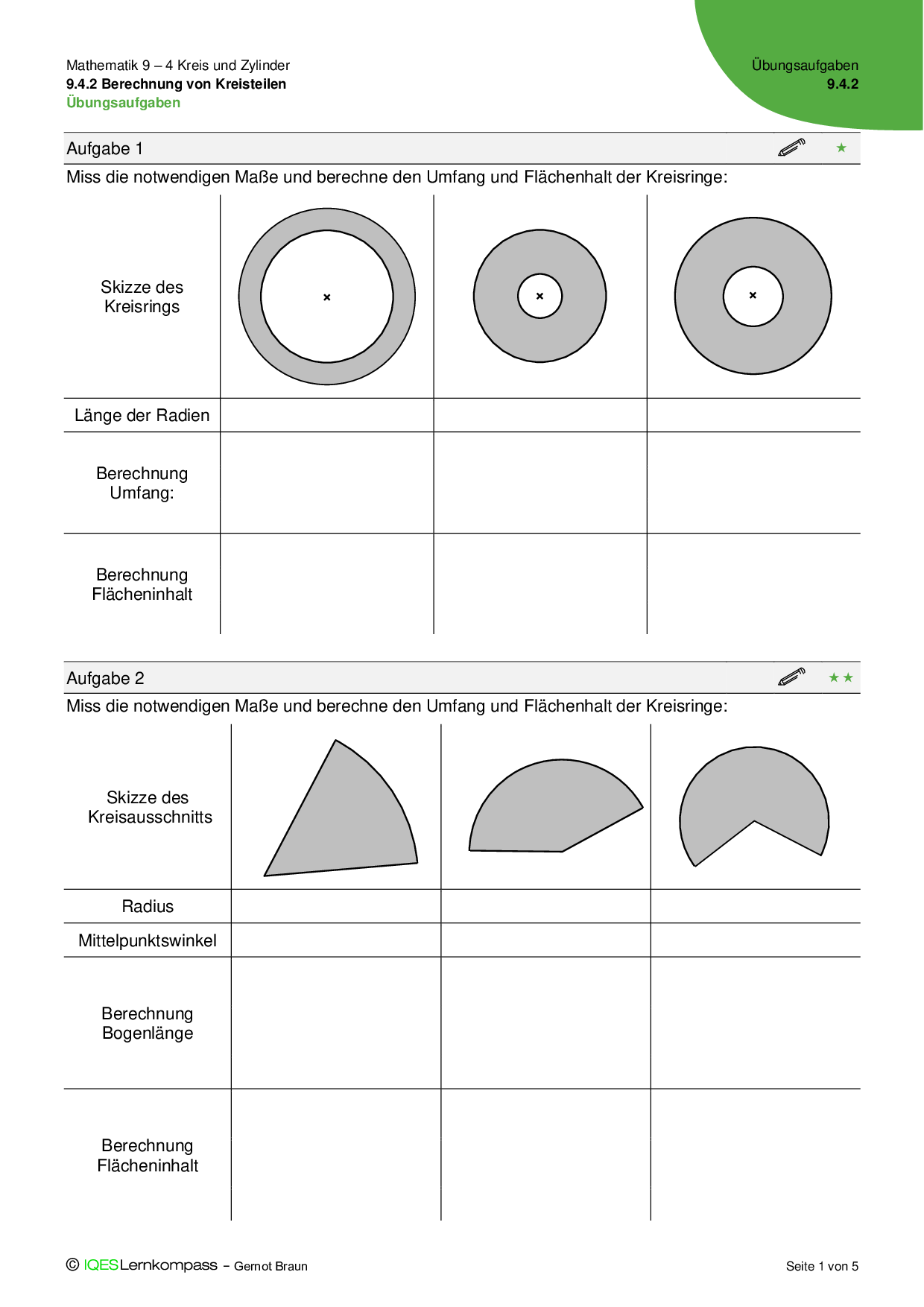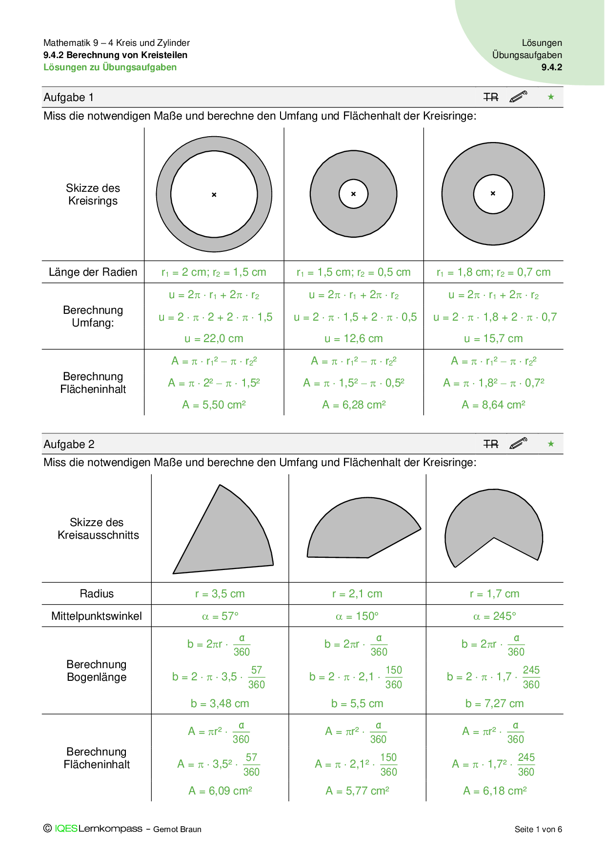 9.4.2 Berechnung von Kreisteilen - Übungsaufgaben mit Lösungen