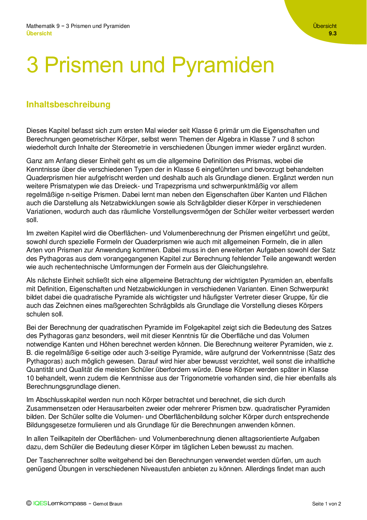 Lernziele und Inhalte: 9.3 Prismen und Pyramiden