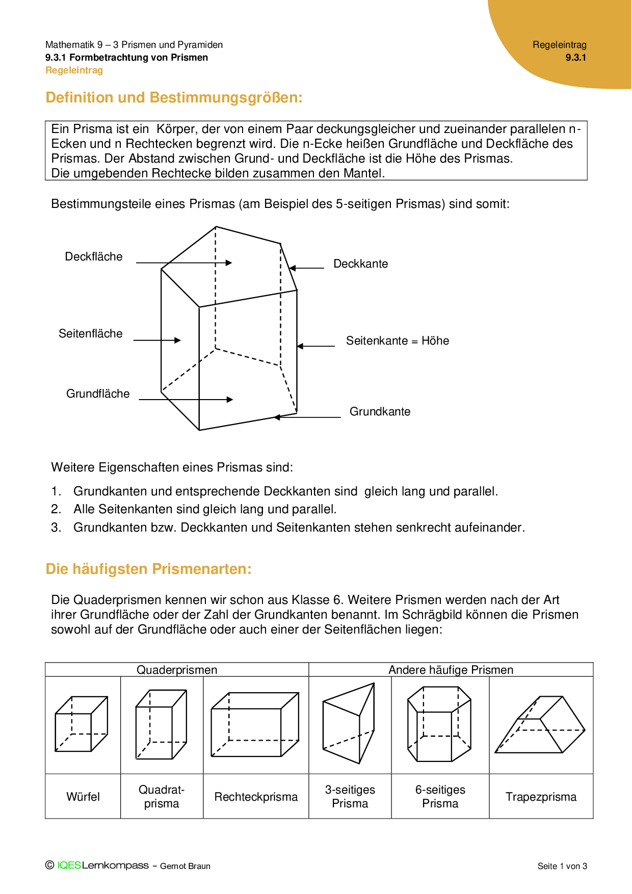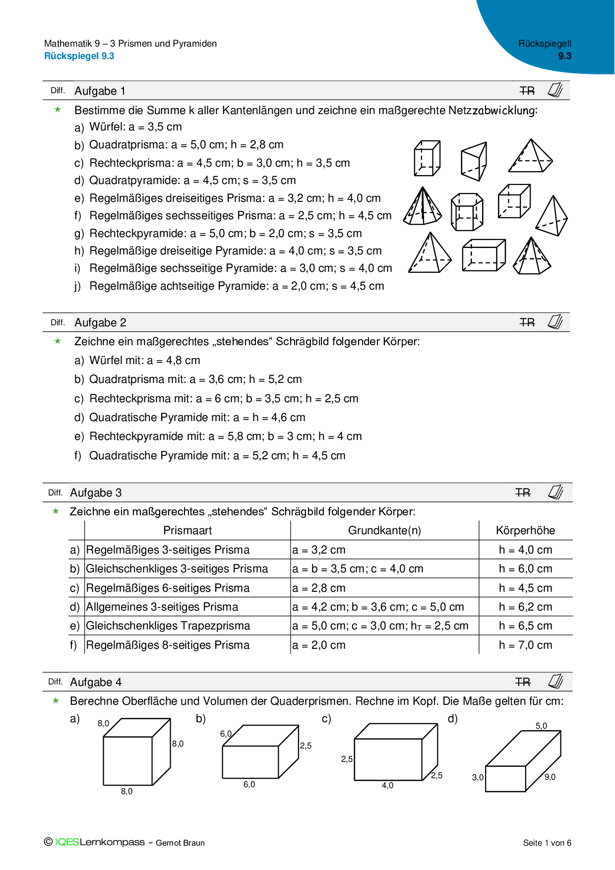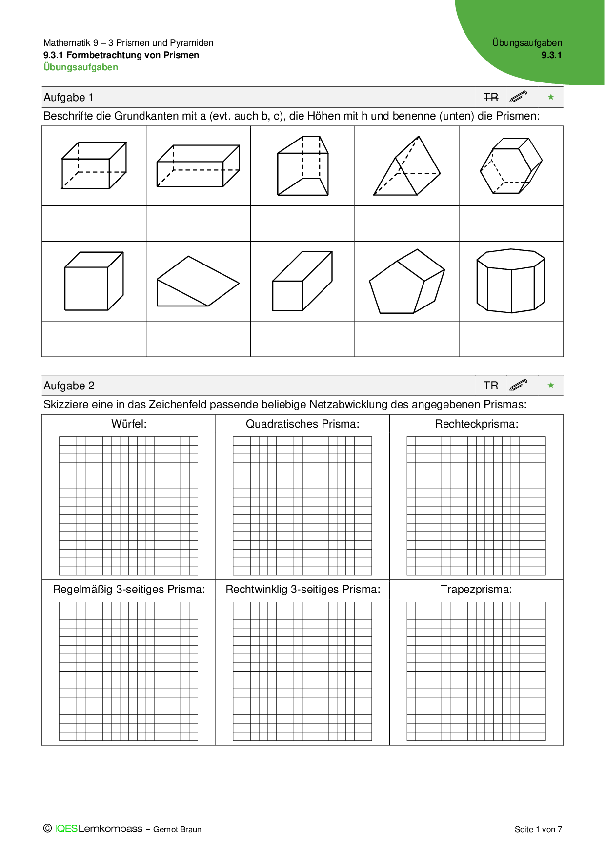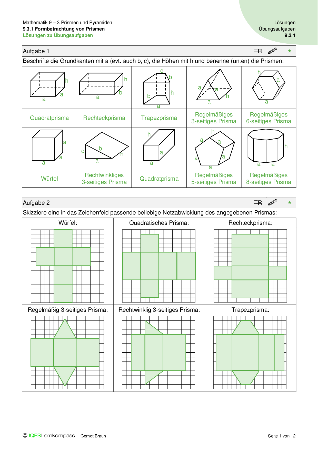 9.3.1 Formbetrachtung von Prismen - Übungsaufgaben mit Lösungen