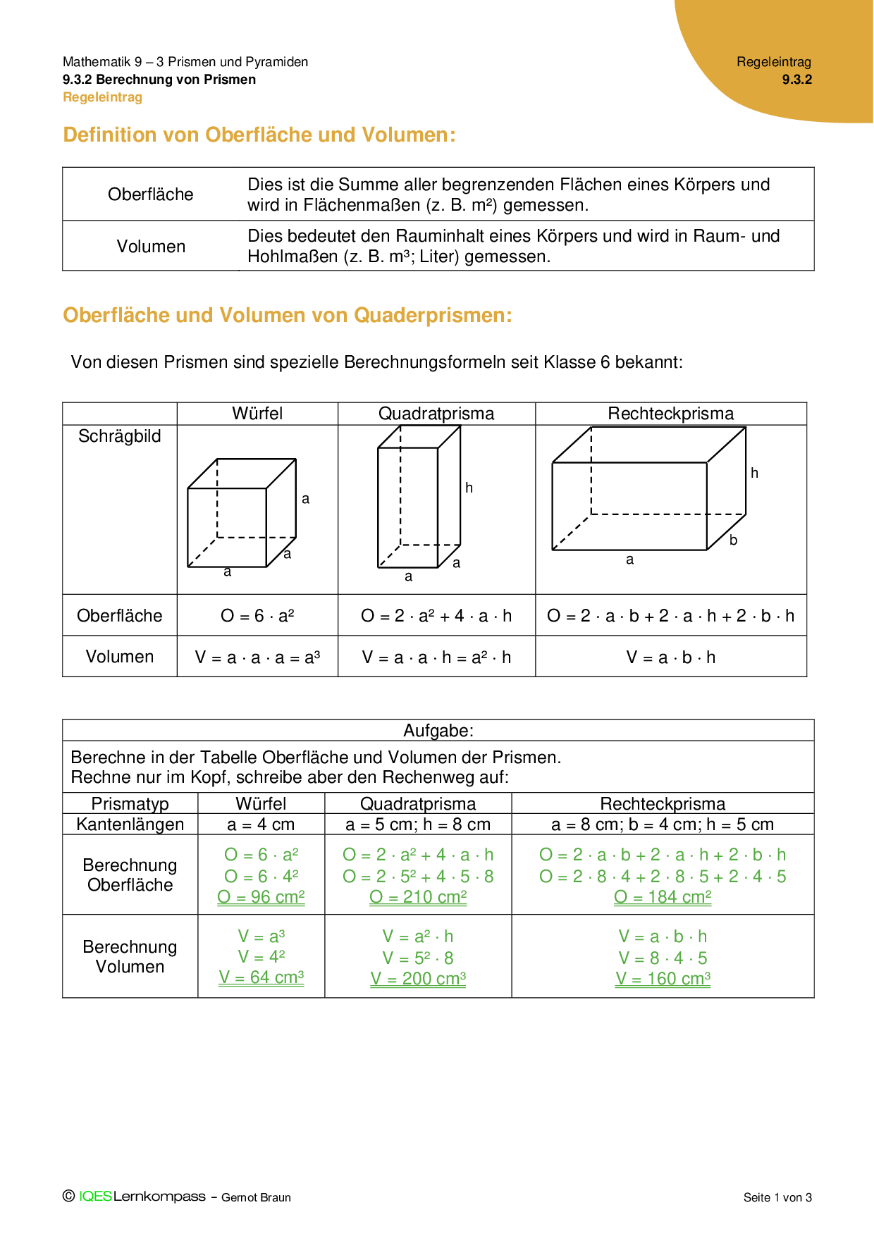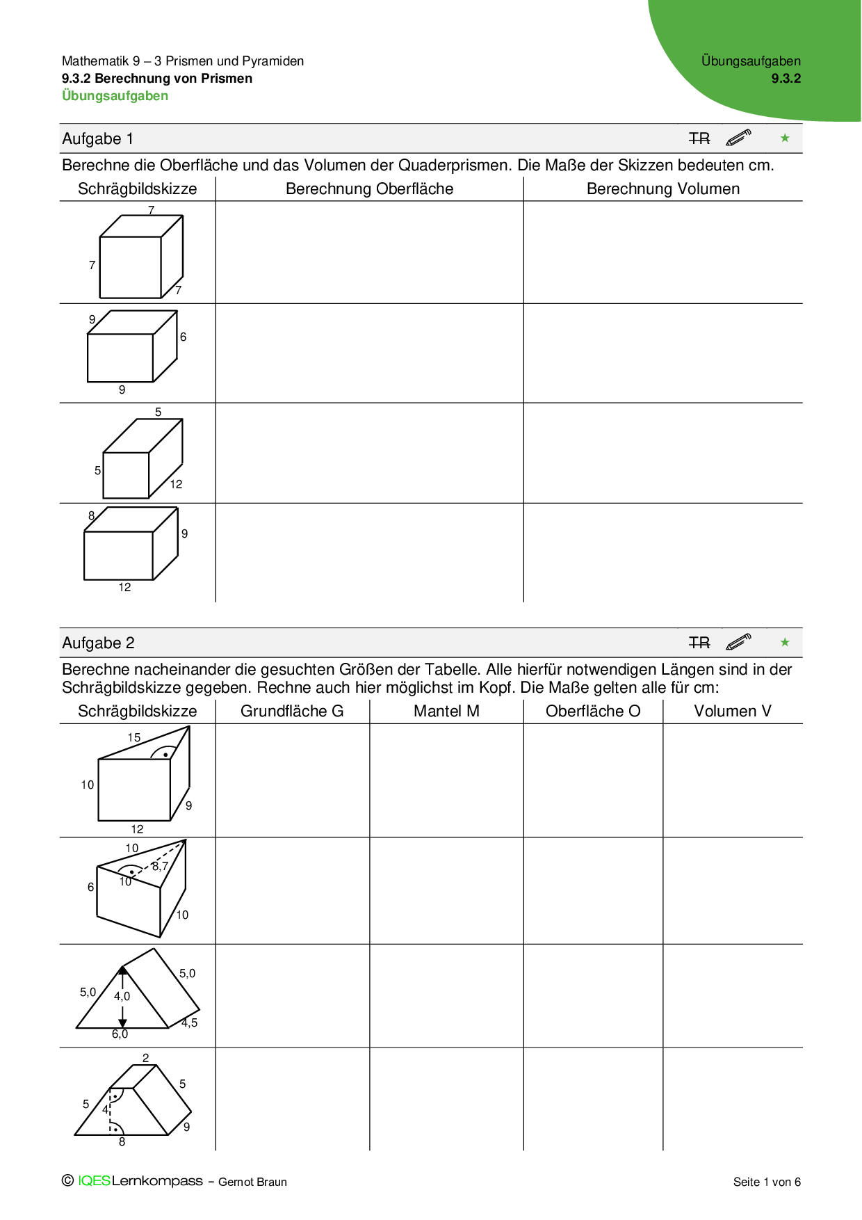 9.3.2 Berechnung von Prismen - Übungsaufgaben mit Lösungen