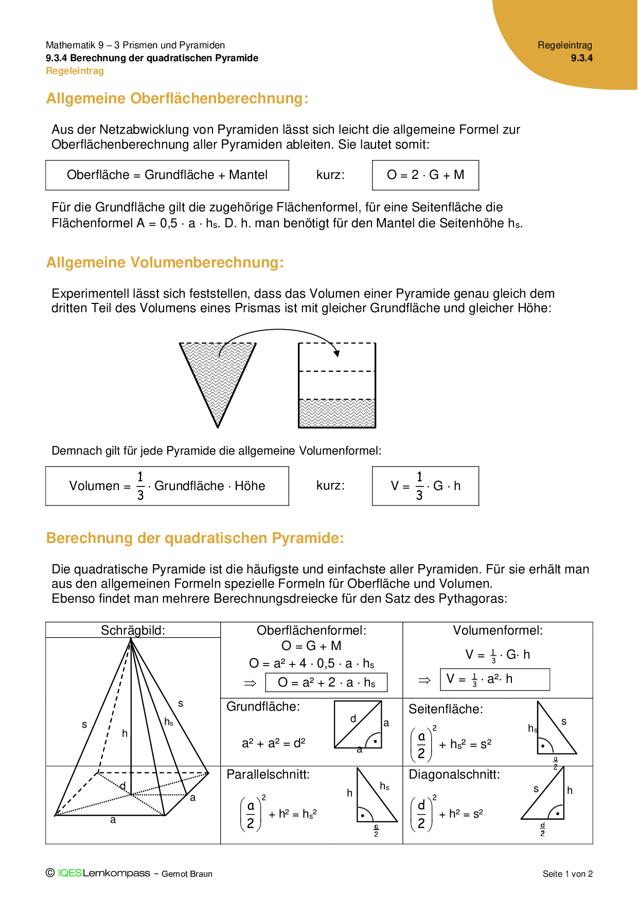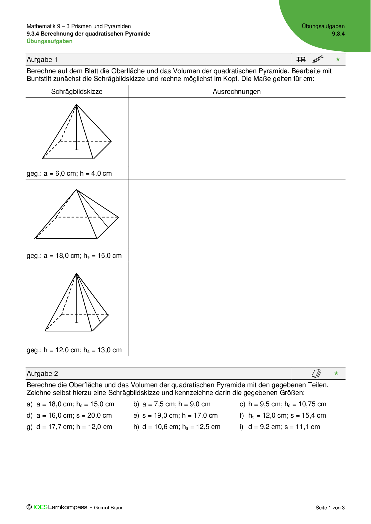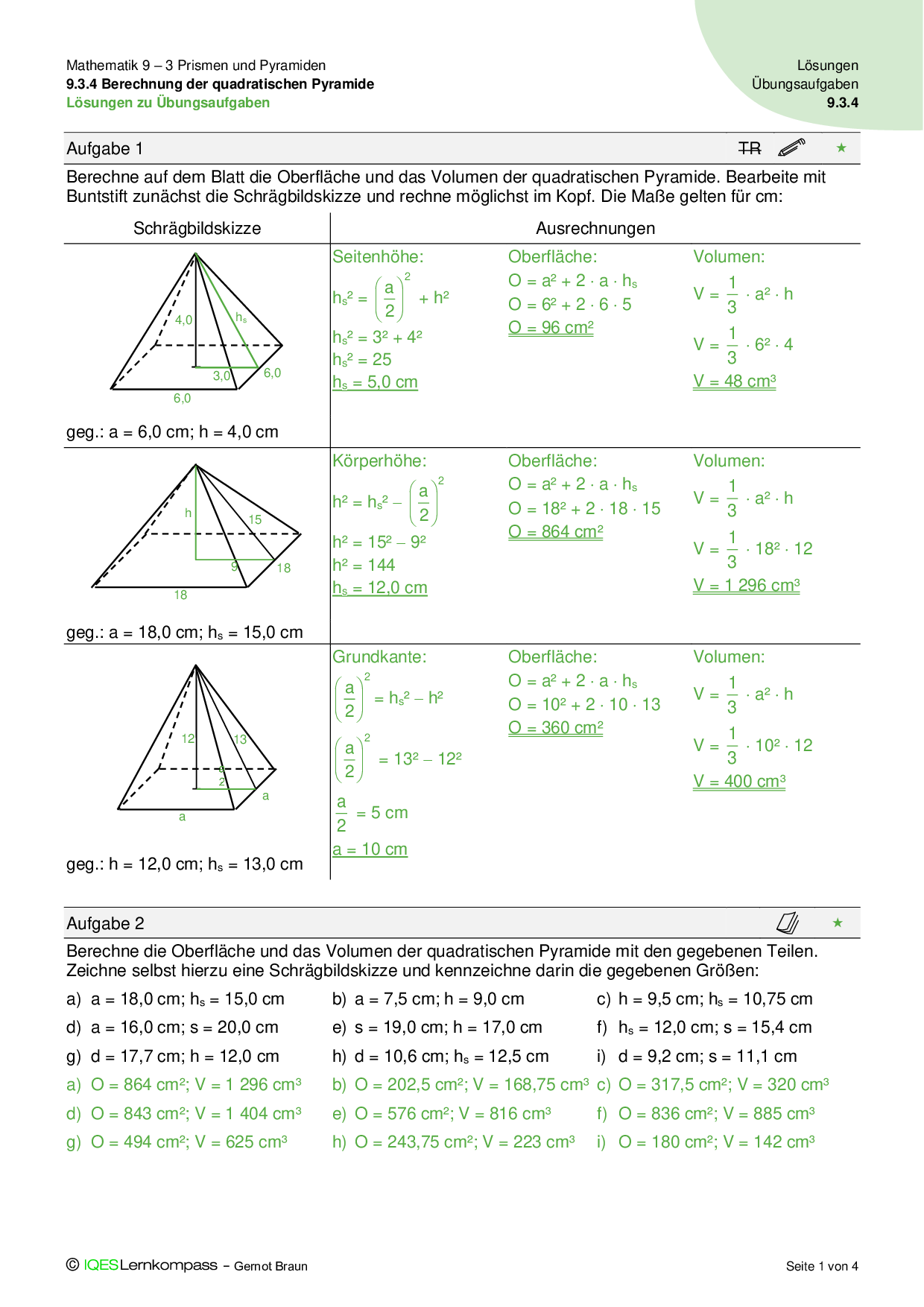 9.3.4 Berechnung der quadratischen Pyramide - Übungsaufgaben mit Lösungen