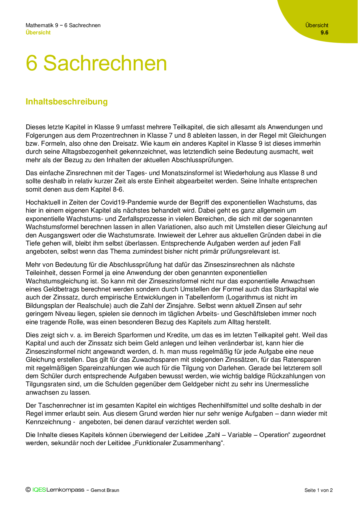 Lernziele und Inhalte: 9.6 Sachrechnen