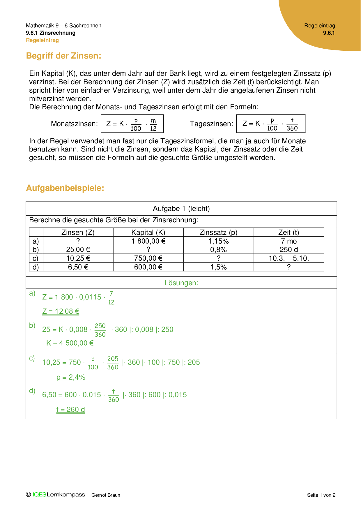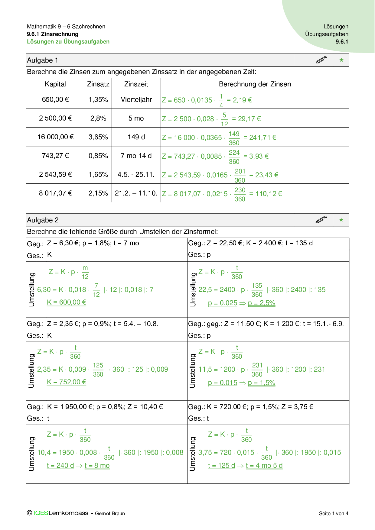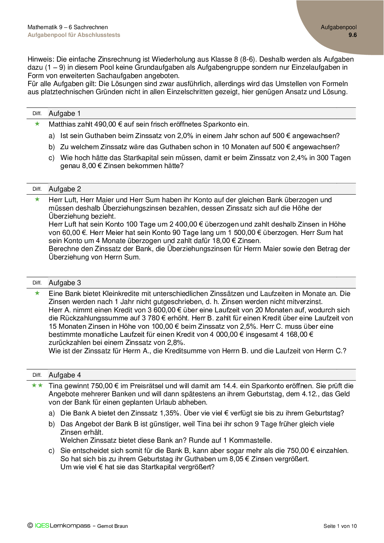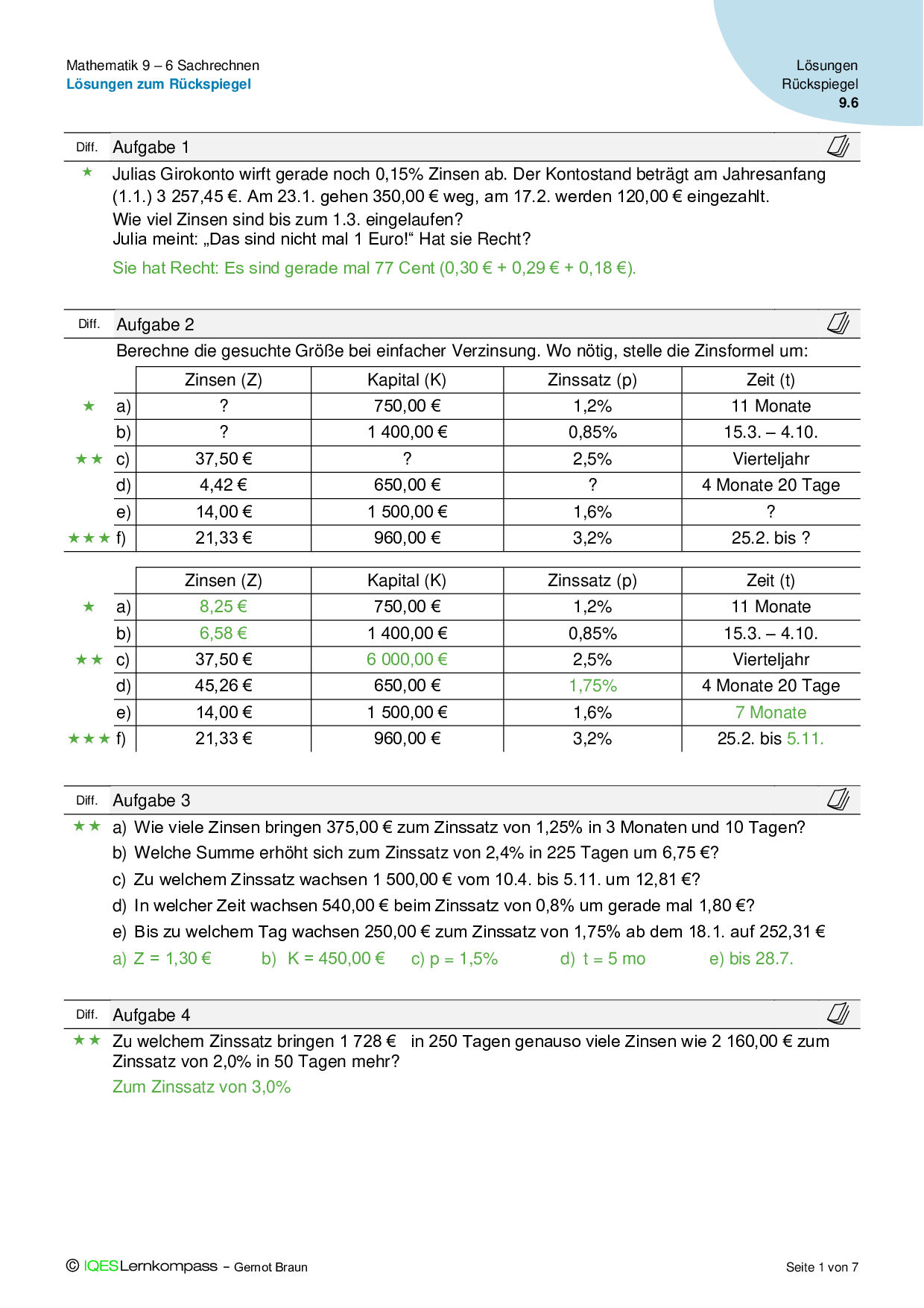 9.6.1 Zinsrechnung - Übungsaufgaben mit Lösungen