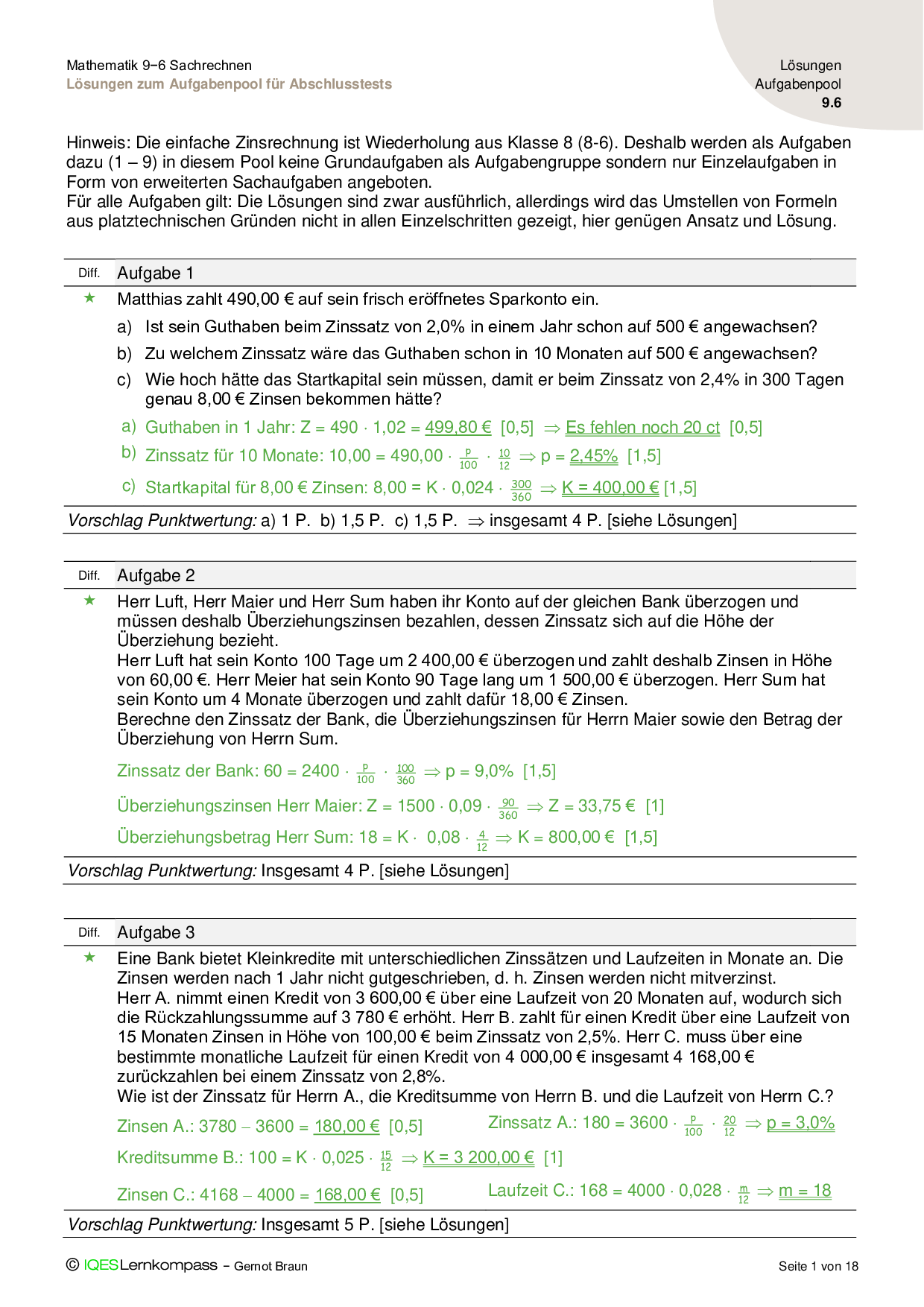 9.6 Sachrechnen - Lösungen zum Aufgabenpool für Abschlusstests