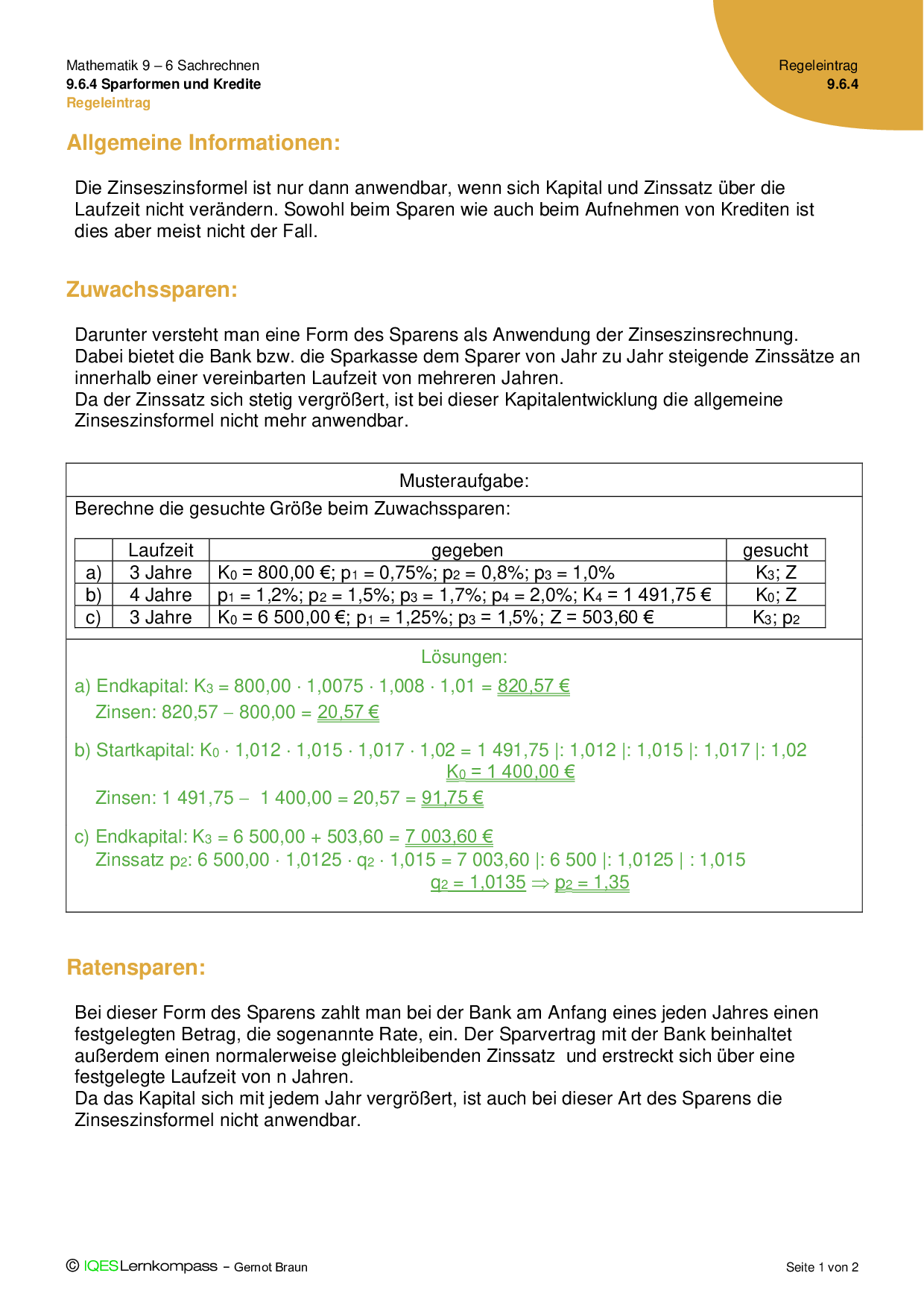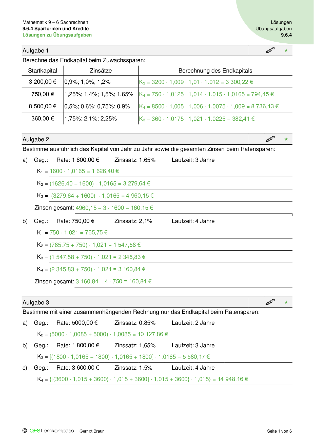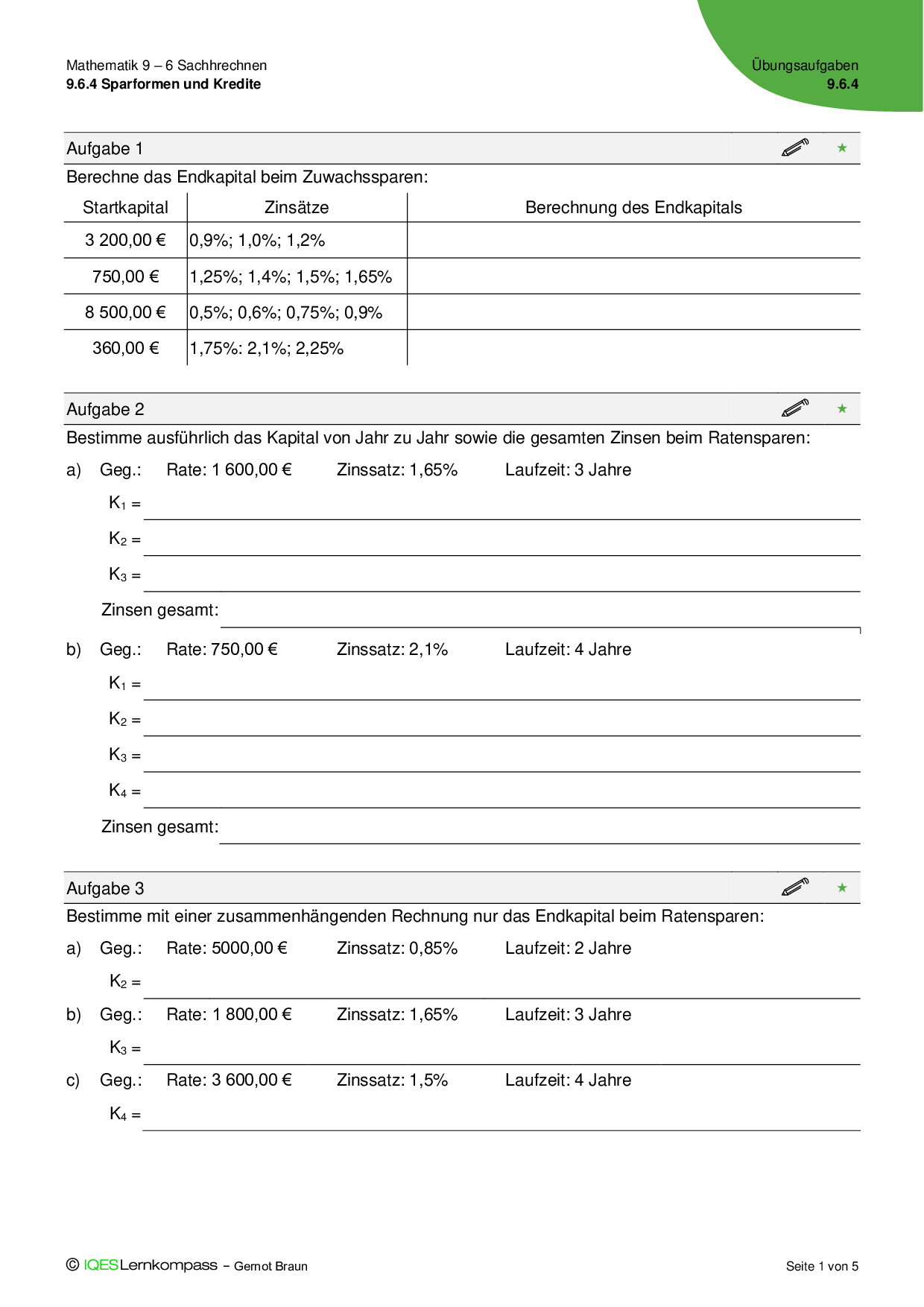 9.6.4 Sparformen und Kredite - Übungsaufgaben mit Lösungen