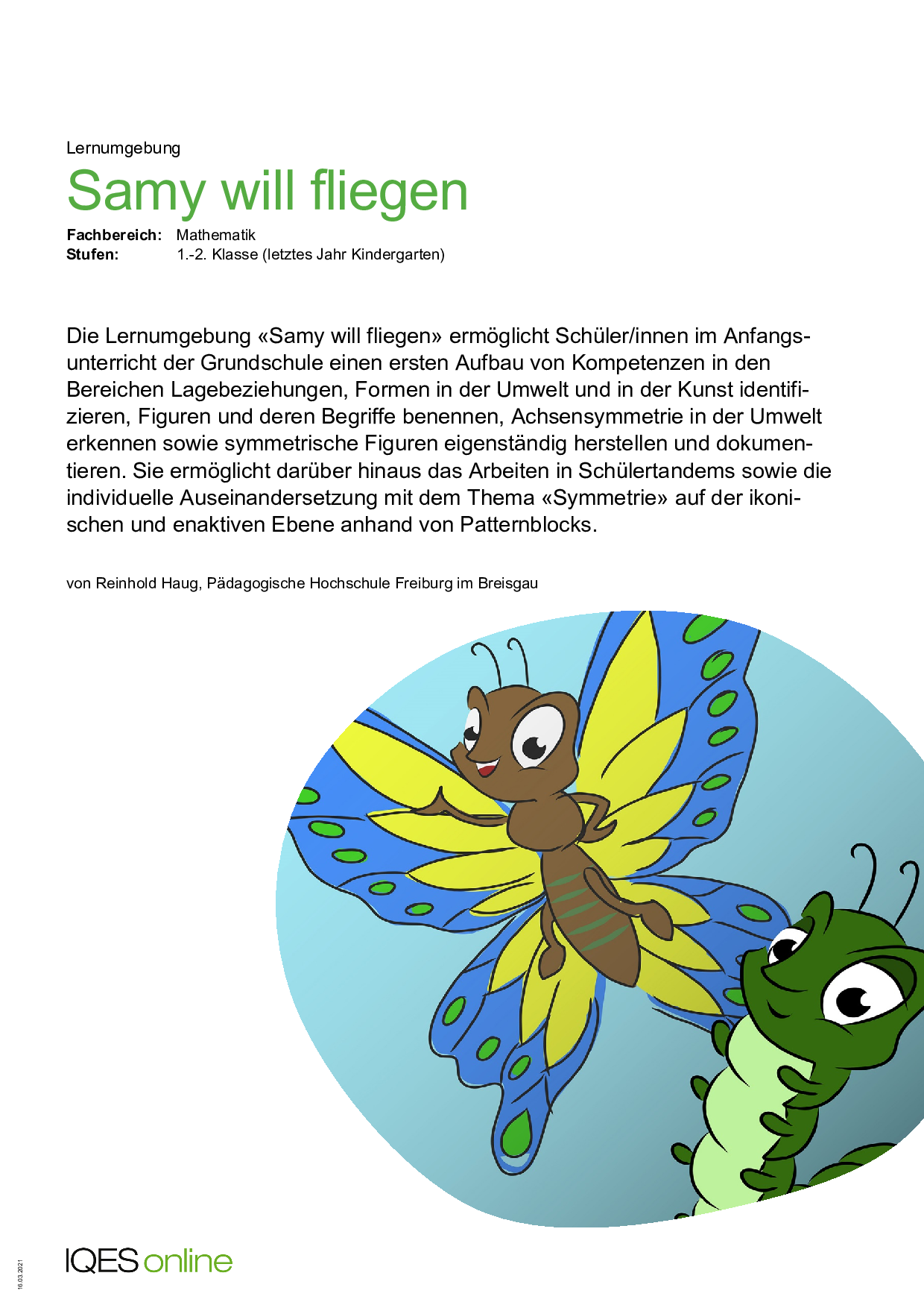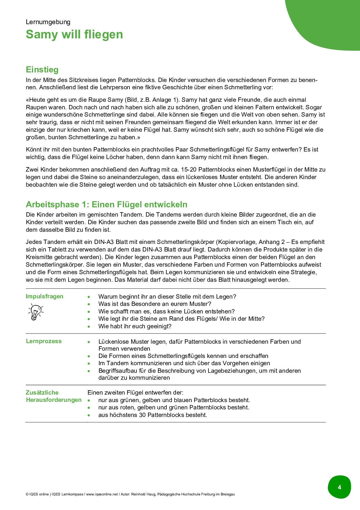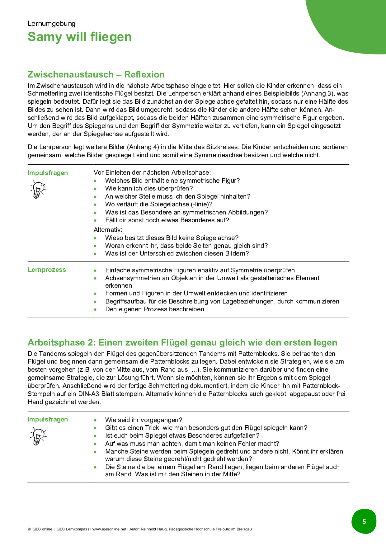 Aus Patternblocks legen die Schüler/innen in Tandems einen Schmetterlingsflügel, die ein Muster beinhalten und aus verschiedenen Farben und Formen bestehen. Der zweite Flügel wird von einem anderen Schüler/innen-Tandem gespiegelt. So setzen sich die Schüler/innen mit dem Thema «Symmetrie» auseinander.