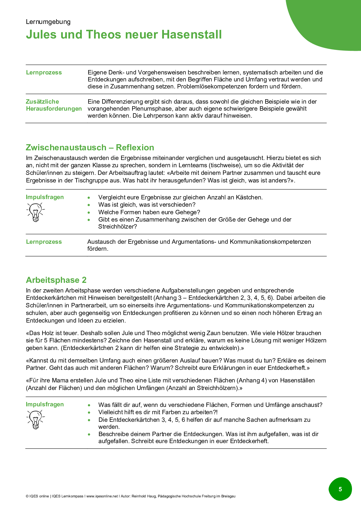 Viele Lernumgebungen setzen neben Plenumsphasen auf offenes, entdeckendes Lernen von Schülerinnen und Schülern in einem kognitiv aktivierenden Unterricht. In solchen Erarbeitungsphasen, in denen Schüler*innen neues Wissen eigenständig ‹konstruieren› und dabei neue Lerninhalte analysieren, strukturieren, Handlungsmuster und Vorstellungen aufbauen und in ihr Wissensnetz integrieren, benötigen Lernende eine besondere Art der Lernbegleitung durch die Lehrperson.Reinhold Haug