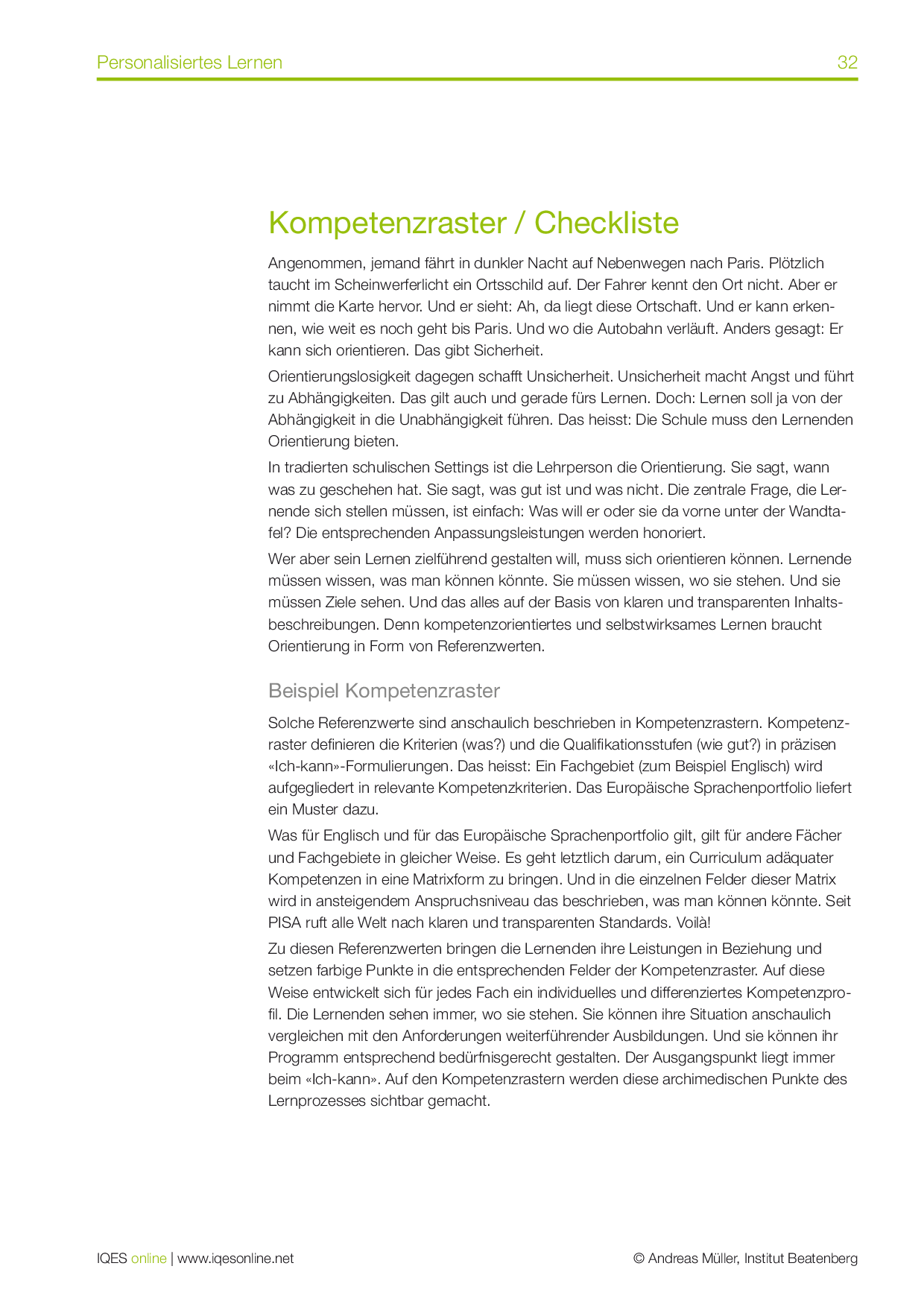 In diesem Auszug aus dem Handbuch Personalisiertes Lernen geht es um Kompetenzrastern und Checklisten. Es werden Argumente und Elemente der beiden Instrumente aufgeführt und verschiedene Beispiele gegeben.