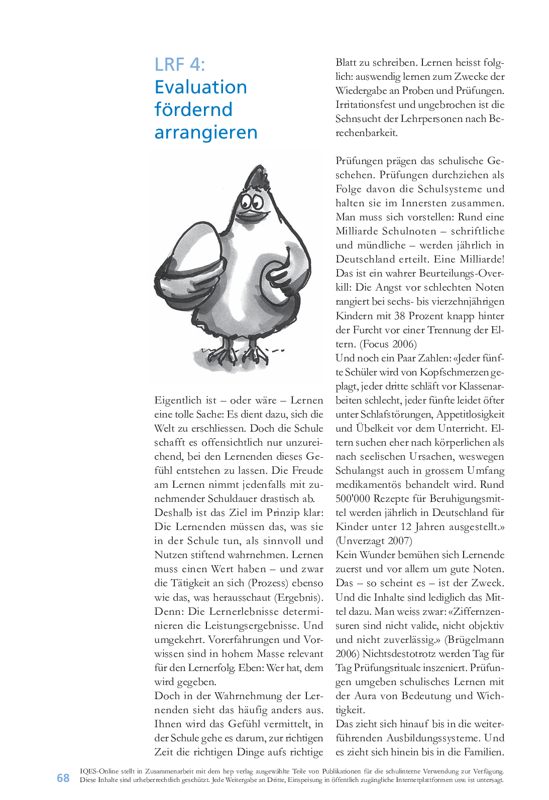 Lernende sollen Freude entwickeln am Umgang mit Widerständen. Eben: mehr ausbrüten, weniger gackern. Das Konzept der Lernrelevanten Faktoren (LRF) bietet viele Ansätze, wie die Schule zum Erfolg der Lernenden beitragen kann. In Theorie und Praxis beschreibt Andreas Müller die verschiedenen Elemente.