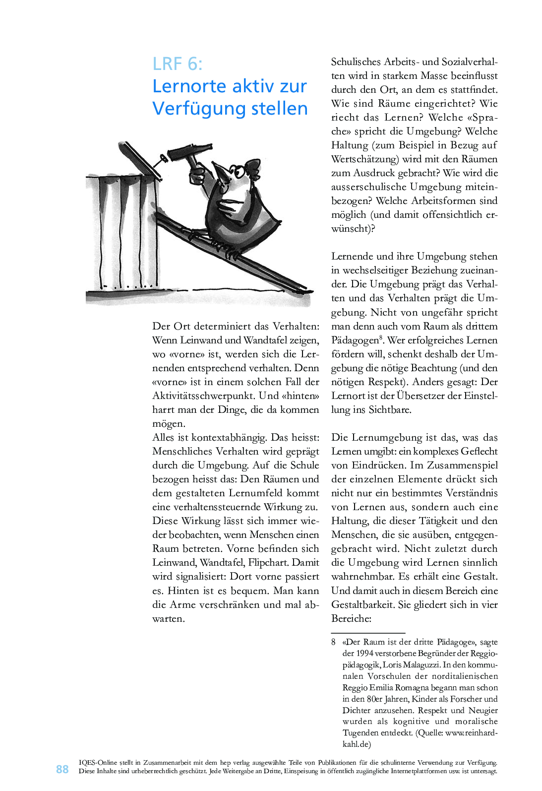 Schulisches Arbeits- und Sozialverhalten wird in starkem Masse beeinflusst durch den Ort, an dem es stattfindet. Wie sind Räume eingerichtet? Wie riecht das Lernen? Welche «Sprache» spricht die Umgebung? Welche Haltung (zum Beispiel in Bezug auf Wertschätzung) wird mit den Räumen zum Ausdruck gebracht? Wie wird die außerschulische Umgebung mit einbezogen? Welche Lern- und Arbeitsformen sind möglich (und damit offensichtlich erwünscht)?