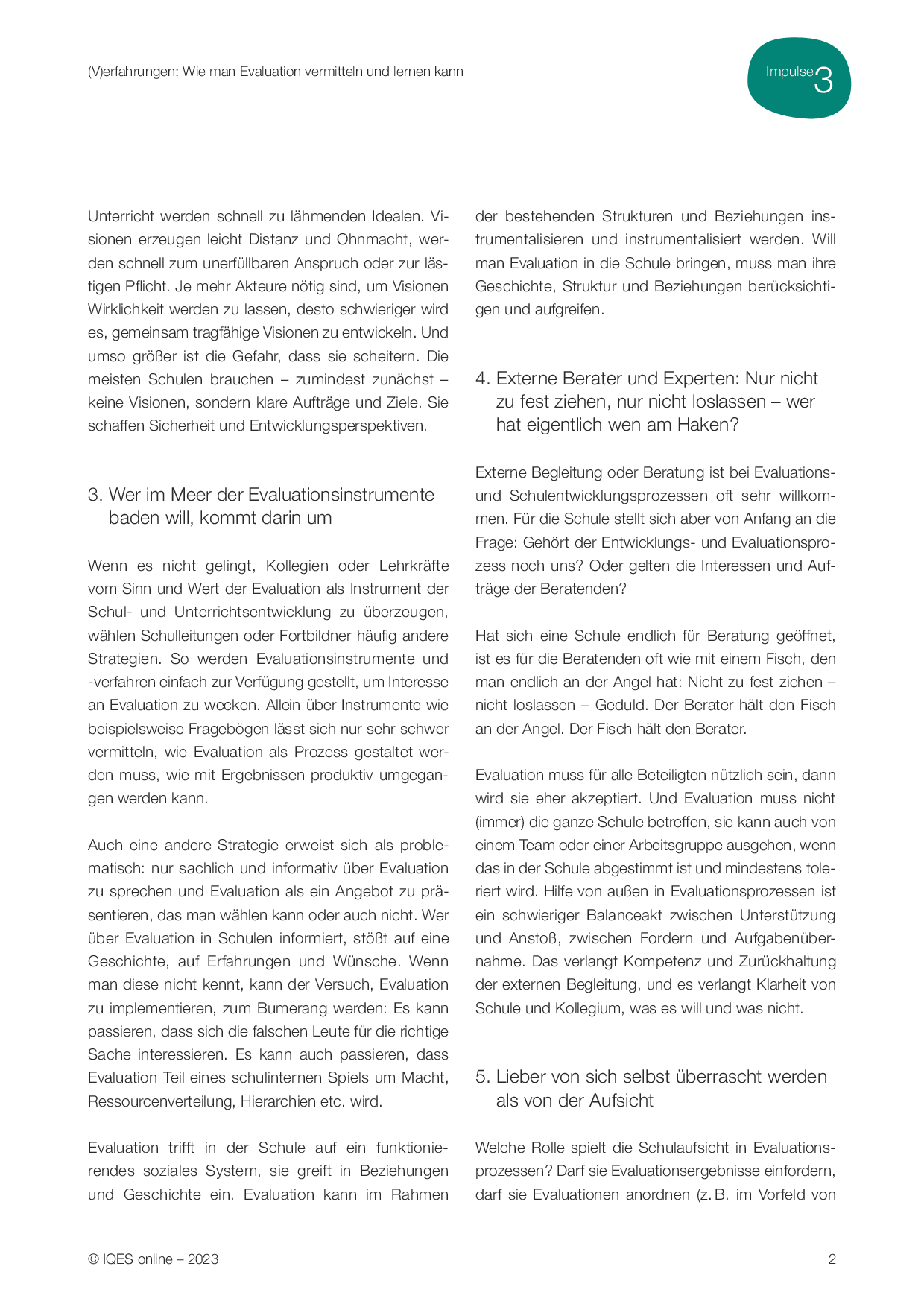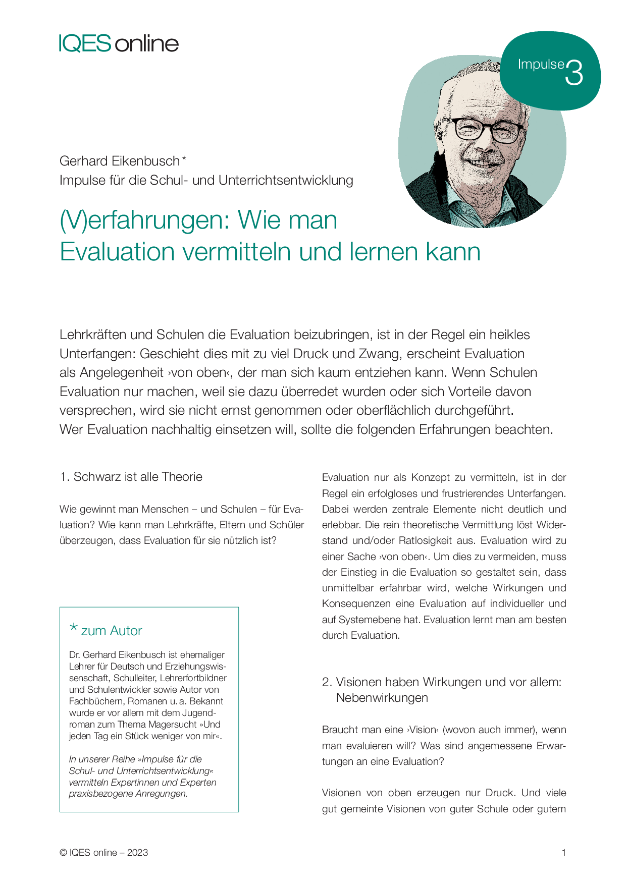 Lehrkräften und Schulen die Evaluation beizubringen, ist in der Regel ein heikles Unterfangen: Geschieht dies mit zu viel Druck und Zwang, erscheint Evaluation als Angelegenheit ›von oben‹, der man sich kaum entziehen kann. Wenn Schulen Evaluation nur machen, weil sie dazu überredet wurden oder sich Vorteile davon versprechen, wird sie nicht ernst genommen oder oberflächlich durchgeführt. Wer Evaluation nachhaltig einsetzen will, sollte die folgenden Erfahrungen beachten.
