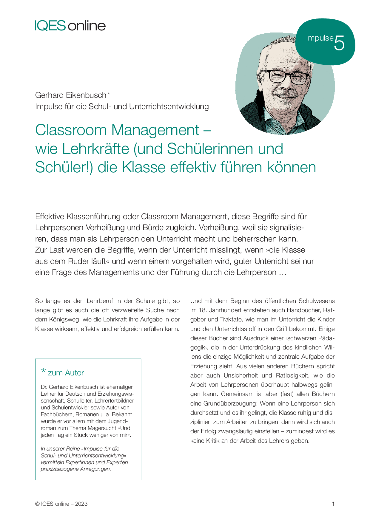 Effektive Klassenführung oder Classroom Management, diese Begriffe sind für Lehrpersonen Verheißung und Bürde zugleich. Verheißung, weil sie signalisieren, dass man als Lehrperson den Unterricht macht und beherrschen kann. Zur Last werden die Begriffe, wenn der Unterricht misslingt, wenn »die Klasse aus dem Ruder läuft« und wenn einem vorgehalten wird, guter Unterricht sei nur eine Frage des Managements und der Führung durch die Lehrperson …