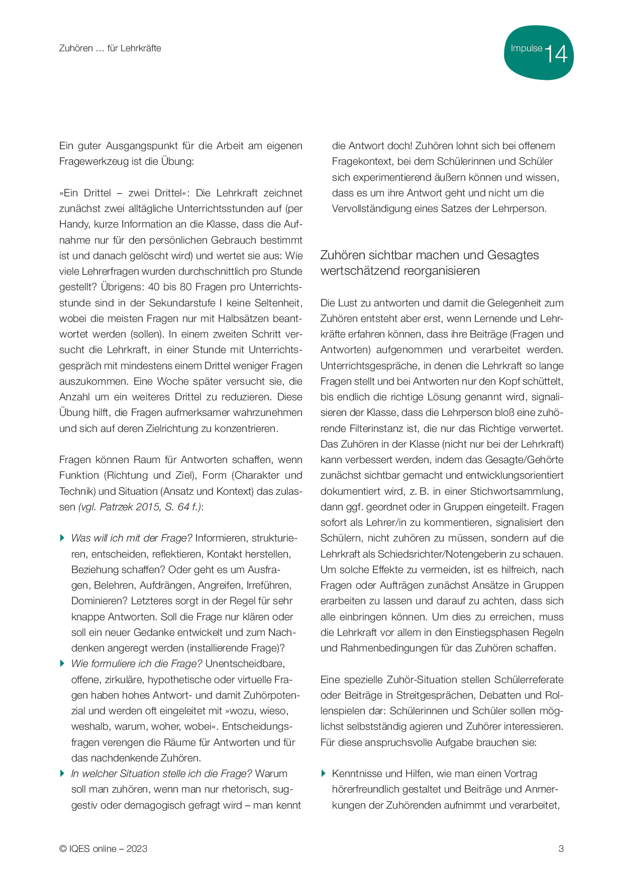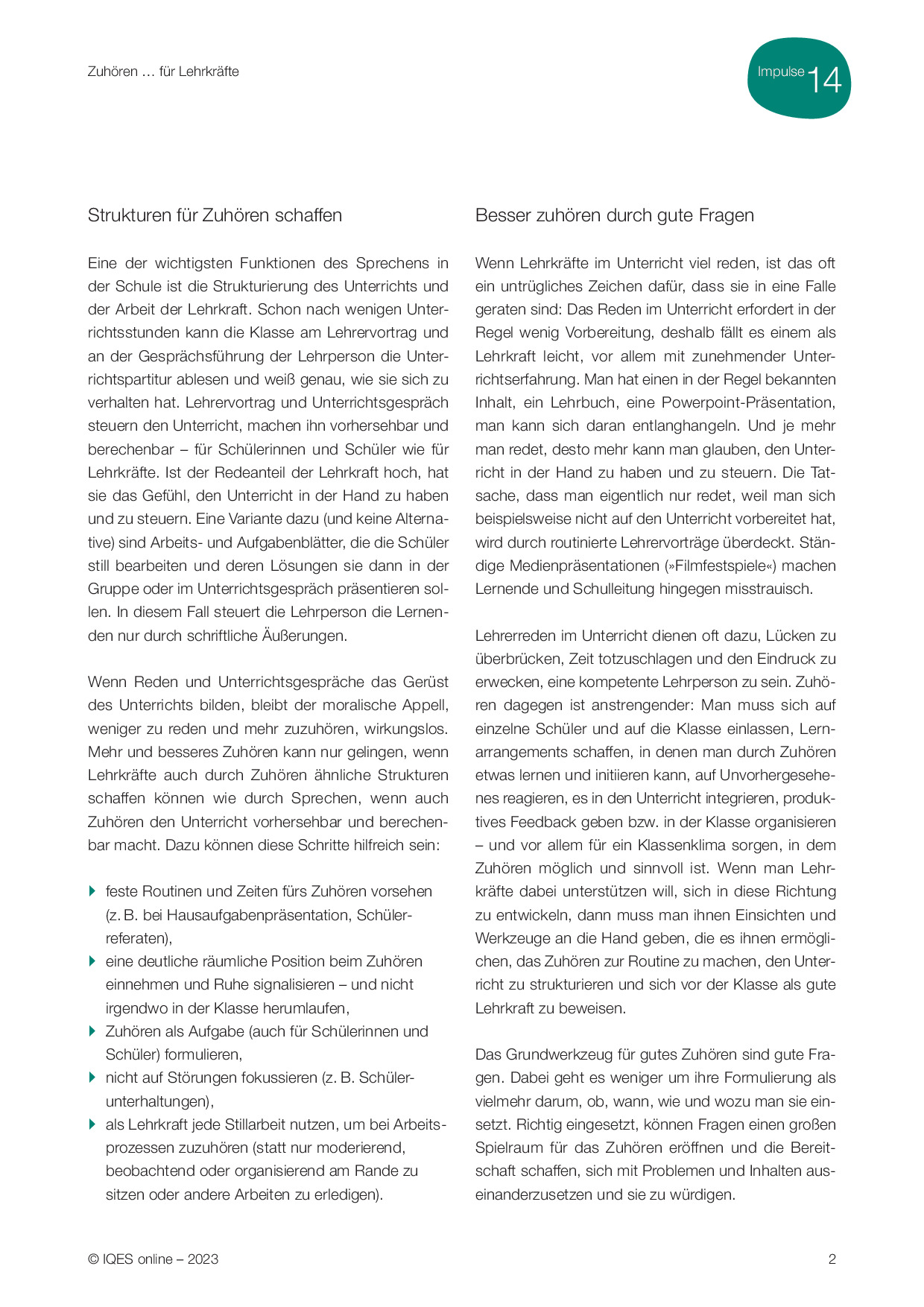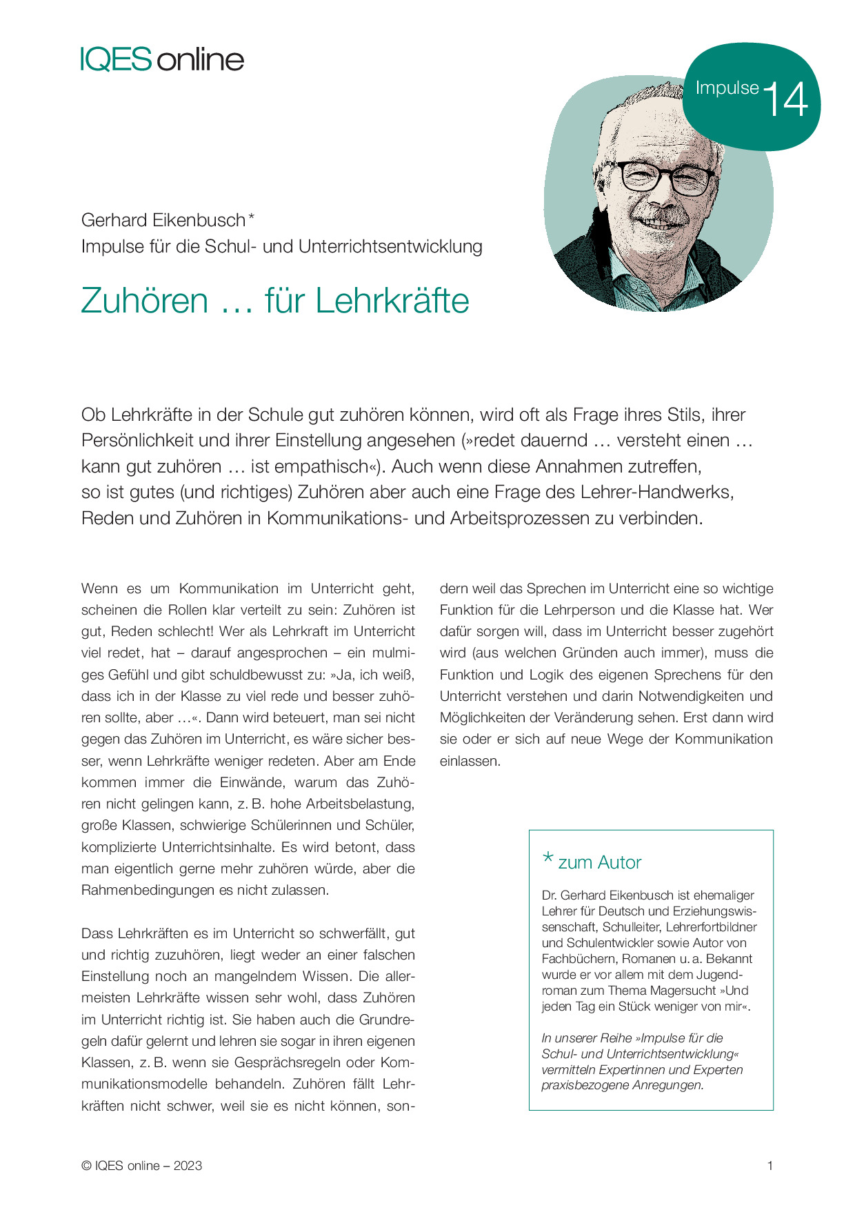 Ob Lehrkräfte in der Schule gut zuhören können, wird oft als Frage ihres Stils, ihrer Persönlichkeit und ihrer Einstellung angesehen (»redet dauernd … versteht einen … kann gut zuhören … ist empathisch«). Auch wenn diese Annahmen zutreffen, so ist gutes (und richtiges) Zuhören aber auch eine Frage des Lehrer-Handwerks, Reden und Zuhören in Kommunikations- und Arbeitsprozessen zu verbinden.