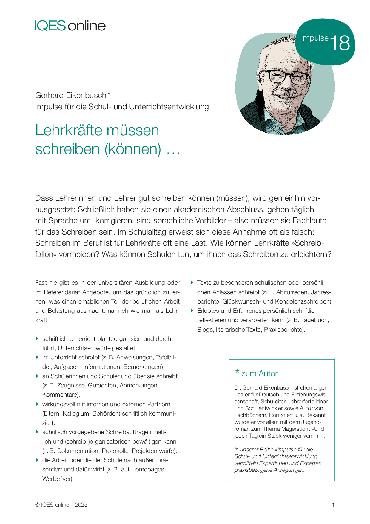 Dass Lehrerinnen und Lehrer gut schreiben können (müssen), wird gemeinhin vorausgesetzt: Schließlich haben sie einen akademischen Abschluss, gehen täglich mit Sprache um, korrigieren, sind sprachliche Vorbilder – also müssen sie Fachleute für das Schreiben sein. Im Schulalltag erweist sich diese Annahme oft als falsch: Schreiben im Beruf ist für Lehrkräfte oft eine Last. Wie können Lehrkräfte »Schreibfallen« vermeiden? Was können Schulen tun, um ihnen das Schreiben zu erleichtern?