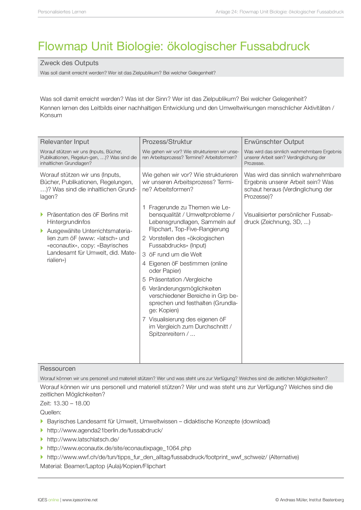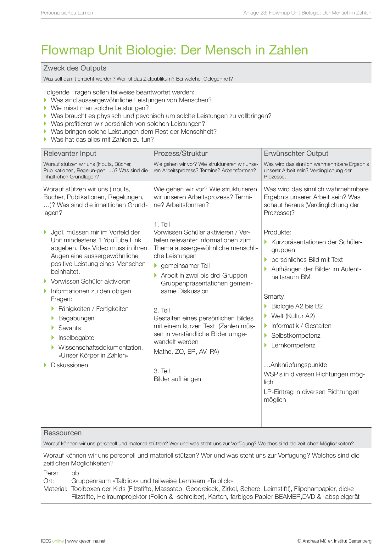 Mit dieser Flowmap kann eine Biologielektion zu aussergewöhnlichen Leistungen des Menschen gestaltet werden. Denn damit kann der Zweck des Outputs, der relevante Input, Prozess/Struktur und der erwünschte Output festgehalten werden.
