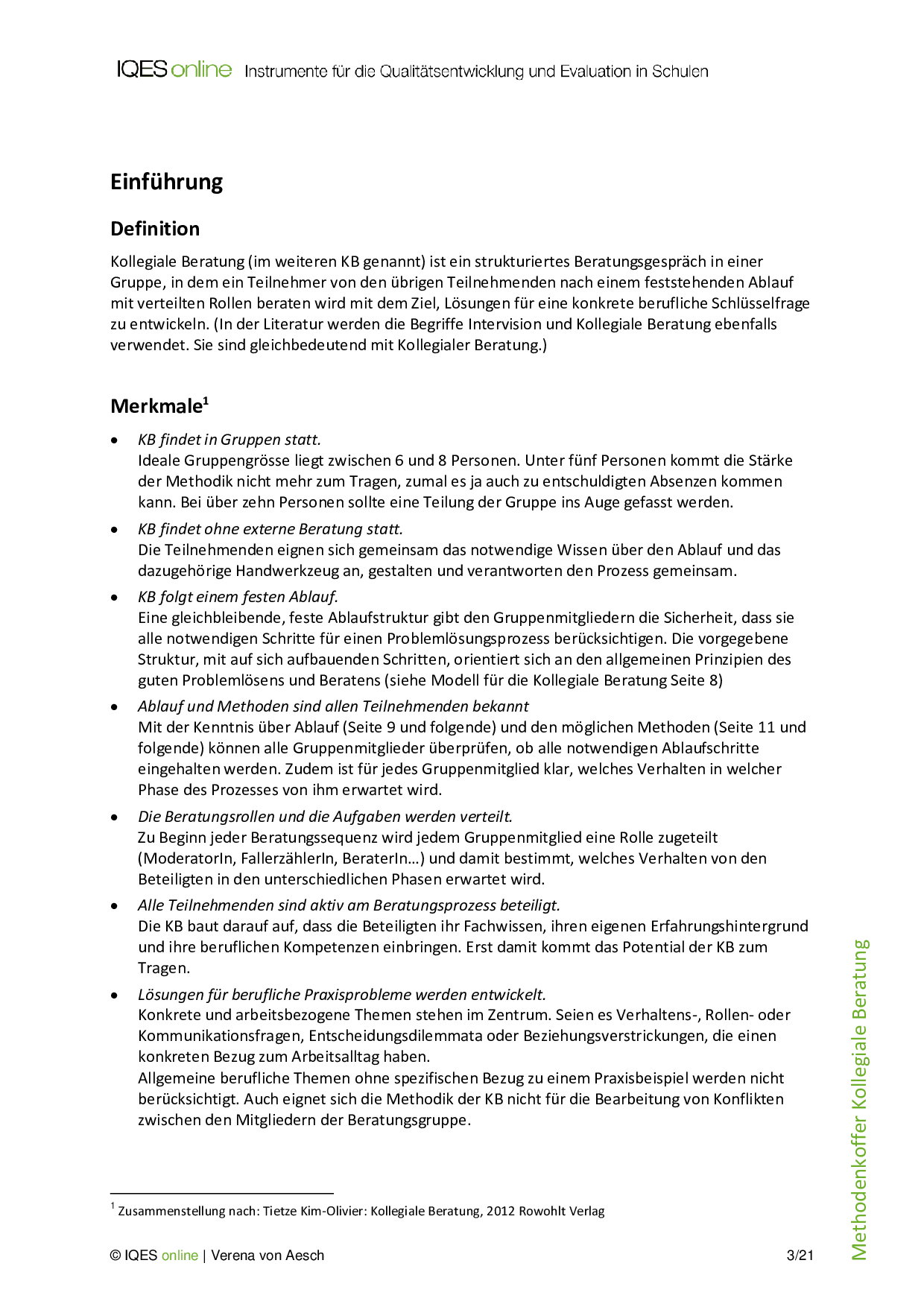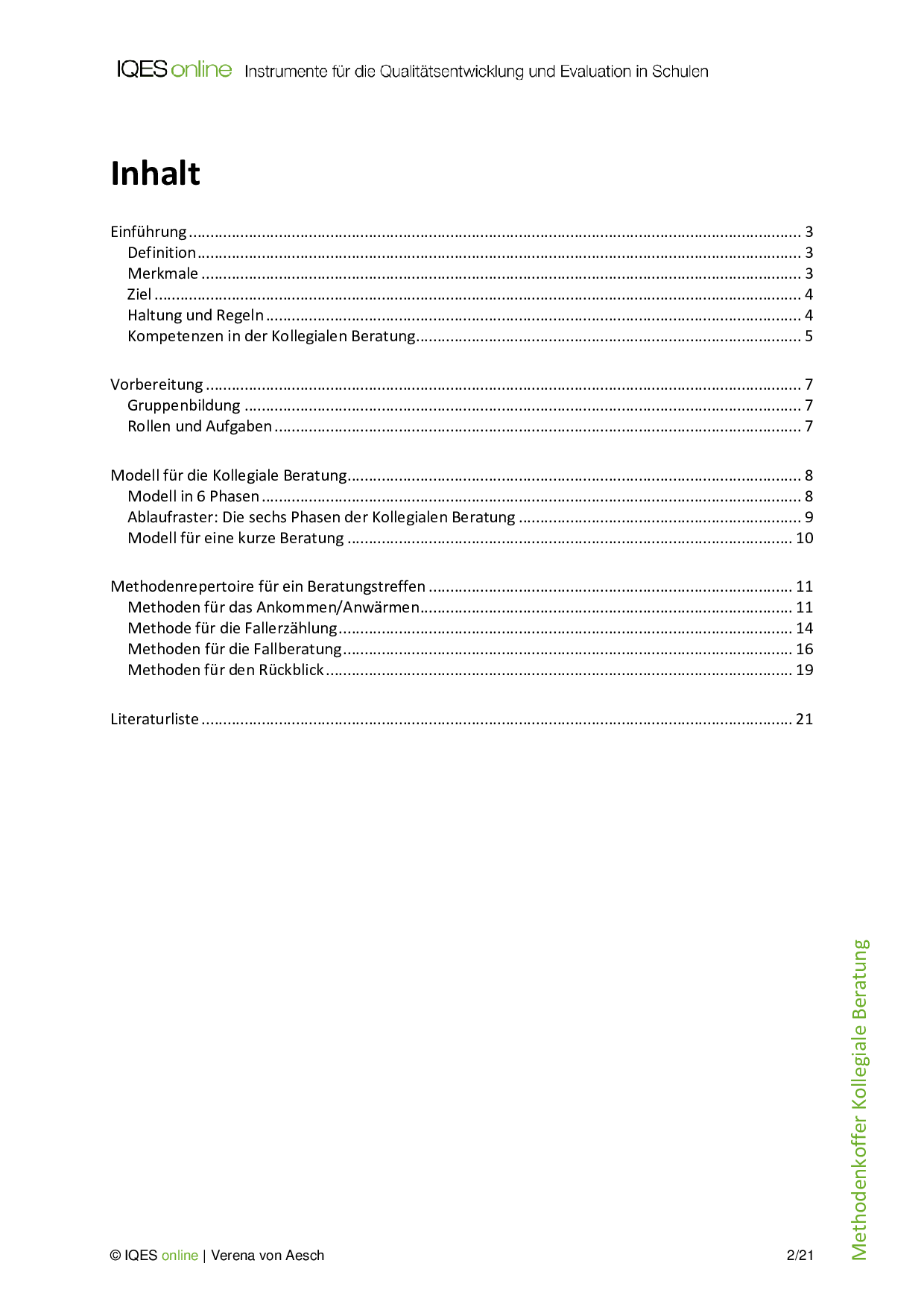 Dieser Methodenkoffer richtet sich an Mitglieder von Unterrichtsteams oder Q-Gruppen. Mithilfe von Kollegialer Beratung – auch Intervision genannt – können die Kolleginnen und Kollegen Lösungsmöglichkeiten für ein konkretes Praxisproblem eines Mitglieds der Gruppe entwickeln, indem alle ihre reichhaltige Praxiserfahrung und ihr Wissen einbringen. Der IQES-Methodenkoffer zeigt, wie man strukturierte Beratungsgespräche in einer Gruppe durchführen kann, mit dem Ziel, Lösungen für eine konkrete berufliche Schlüsselfrage zu entwickeln.